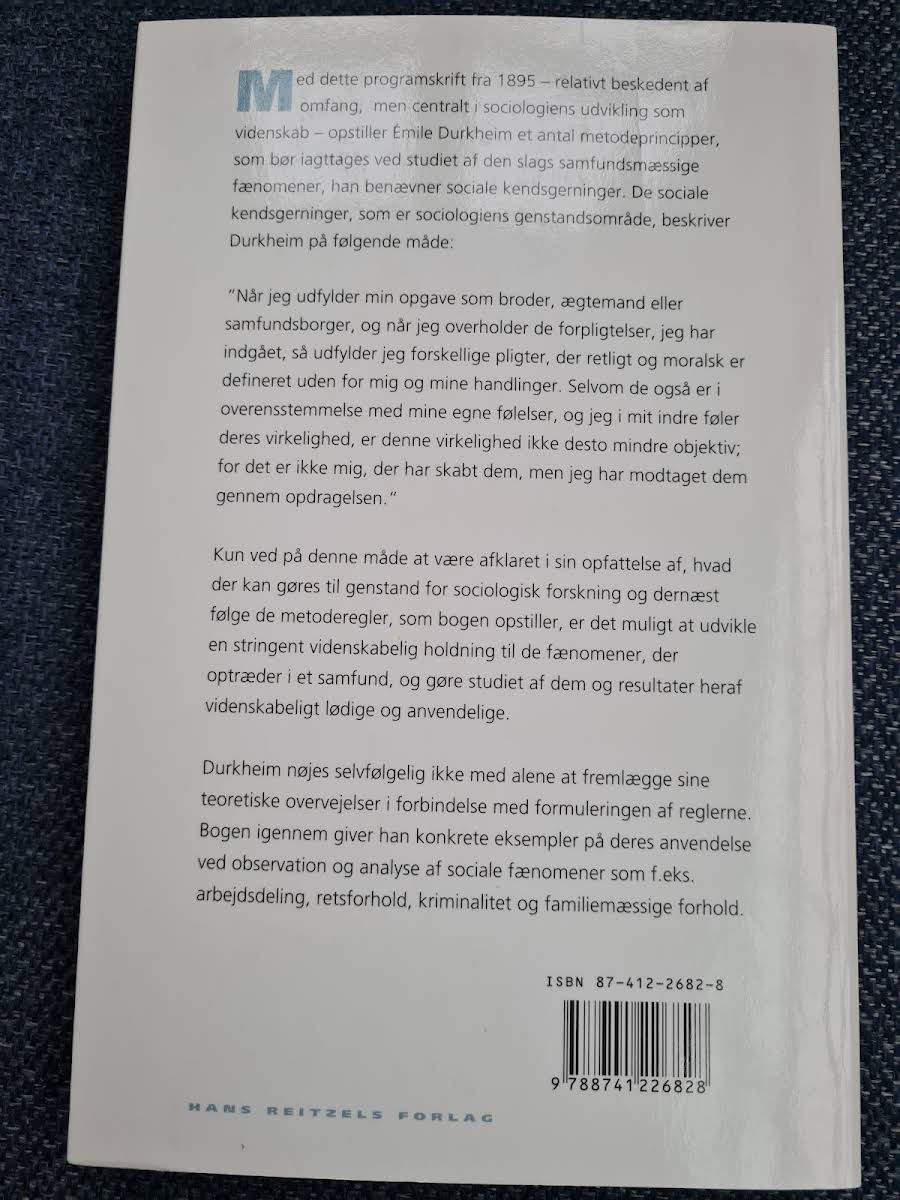 Émile Durkheims "Den sociologiske metodes regler" udgør et centralt bidrag til samfundsvidenskaben, hvor forfatteren tydeliggør, hvordan man systematisk kan studere de overordnede sociale love og sammenhænge, der definerer et samfund. I værket præsenterer Durkheim en række metodeprincipper, som skal danne grundlag for analysen af de såkaldte ’sociale kendsgerninger’ – de fænomener, der går ud over de enkelte individer og binder samfundet sammen. Gennem konkrete eksempler illustrerer han, hvordan disse principper kan anvendes i studiet af centrale samfundsmæssige kategorier såsom arbejdsdeling, retssystemer, kriminalitet og familieforhold. Ved at gøre dette lægger han fundamentet for en dybere forståelse af, hvordan sociale strukturer og mekanismer fungerer. I den 2005 udgave, udgivet af Hans Reitzels Forlag, forstærkes værkets relevans med en introduktion af lektor Gorm Harste fra Institut for Statskundskab ved Århus Universitet. Oversat fra fransk af Esbern Krause-Jensen, forbliver "Den sociologiske metodes regler" en uundværlig klassiker for alle, der ønsker at dykke ned i sociologiens grundlæggende principper og metoder.