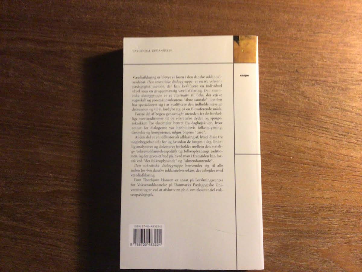I "Den sokratiske dialoggruppe – Et værktøj til værdiafklaring" præsenteres læseren for en metode, der kombinerer den sokratiske samtale med konkrete praksiseksempler for både individuel og organisatorisk værdiafklaring. Bogen indeholder en systematisk gennemgang af, hvordan denne dialoggruppe kan benyttes til at belyse og udfordre de grundlæggende værdier, som rører op i centrale debatter om folkeoplysning, dannelse og kompetence. Med et kritisk blik på det udbredte fokus på kompetencebegrebet, tilbyder forfatteren Finn Thorbjørn Hansen en nødvendig refleksion og en ny tilgang til værdiafklaring. Denne første udgave fra Gyldendal indeholder 351 sider, hvor den sokratiske metode præsenteres som et innovativt redskab, der allerede er i brug i blandt andet Tyskland, Holland og England, og som kan inspirere alle, der arbejder med eller er interesseret i pædagogik og værdibaseret undervisning.