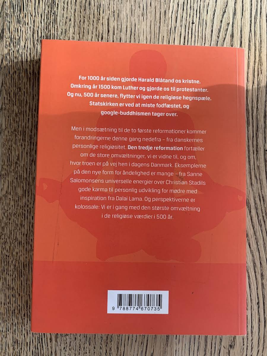 For et millennium siden samlede Harald Blåtand danskerne under kristendommen, og med Luther for 500 år siden skiftede vi til protestantismen. I dag ryster vi mindre topstyrede trosfællesskaber og lader nye strømninger trænge ind, mens statskirken mister sin faste position. Den tredje reformation sker ikke ovenfra, men spirer i det enkelte menneskes søgen efter mening. Morten Thomsen Højsgaard undersøger, hvordan personlig spiritualitet og løsrevne overbevisninger præger vores religiøse landskab, og hvor troen bevæger sig hen i nutidens Danmark. Bogen præsenterer konkrete eksempler på moderne åndelighed - fra Sanne Salomonsens energiøvelser til Christian Stadils fokus på karmabalancen og mødres selvudvikling inspireret af Dalai Lama. Vi står midt i den største omvæltning af religiøse værdier i et halvt årtusinde.