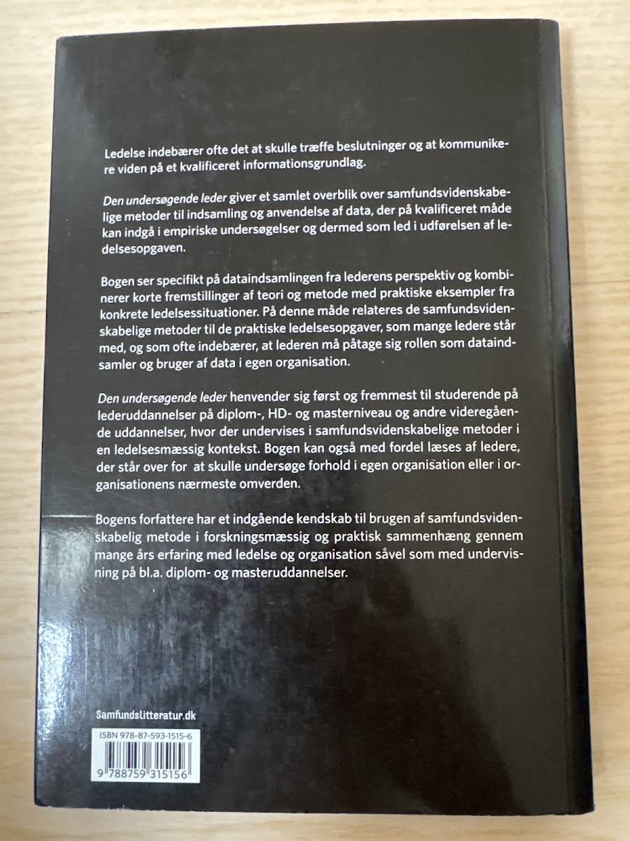 Den undersøgende leder af Steen Hvid og Jørn Kjølseth Møller er en central ressource for ledere under Diplomlederuddannelsen og for andre, der ønsker at styrke deres ledelseskompetencer. Bogen præsenterer metodiske og videnskabsteoretiske overvejelser, som understøtter beslutningsprocesser og dokumentation af organisatoriske indsatser. Med et solidt fundament i samfundsvidenskabelige metoder leverer bogen praktiske eksempler og giver læseren redskaber til at analysere problemstillinger ud fra en ledelsesposition. Den undersøgende leder fungerer både som undervisningsbog og som håndbog, der kan guide lederen i indsamling og bearbejdning af viden om egen organisation.