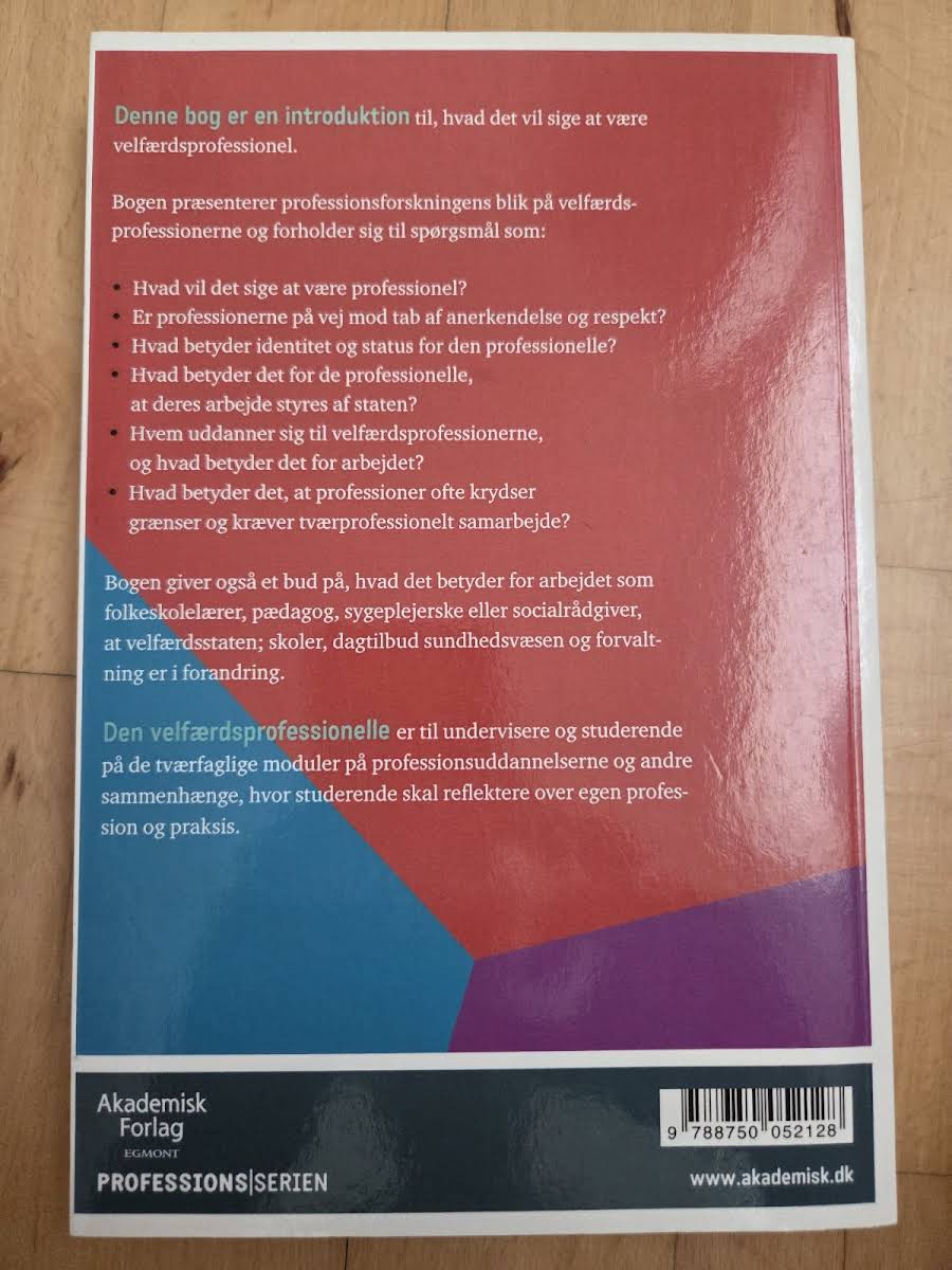 Den velfærdsprofessionelle giver en nuanceret introduktion til, hvad det vil sige at arbejde som velfærdsprofessionel. Bogen lægger et analytisk blik på professionsforskningen og udforsker centrale spørgsmål som, hvad det vil sige at have en professionel identitet og status, og hvordan arbejdet påvirkes af statens styrende institutioner. Med fokus på grænseoverskridende opgaver og den stigende betydning af tværprofessionelt samarbejde, undersøger bogen, hvem der uddanner sig til velfærdsprofessionerne, og hvad disse uddannelser betyder for det praktiske arbejde. Bogen er en værdifuld ressource for både studerende og undervisere, der beskæftiger sig med de tværfaglige moduler på professionsuddannelserne.