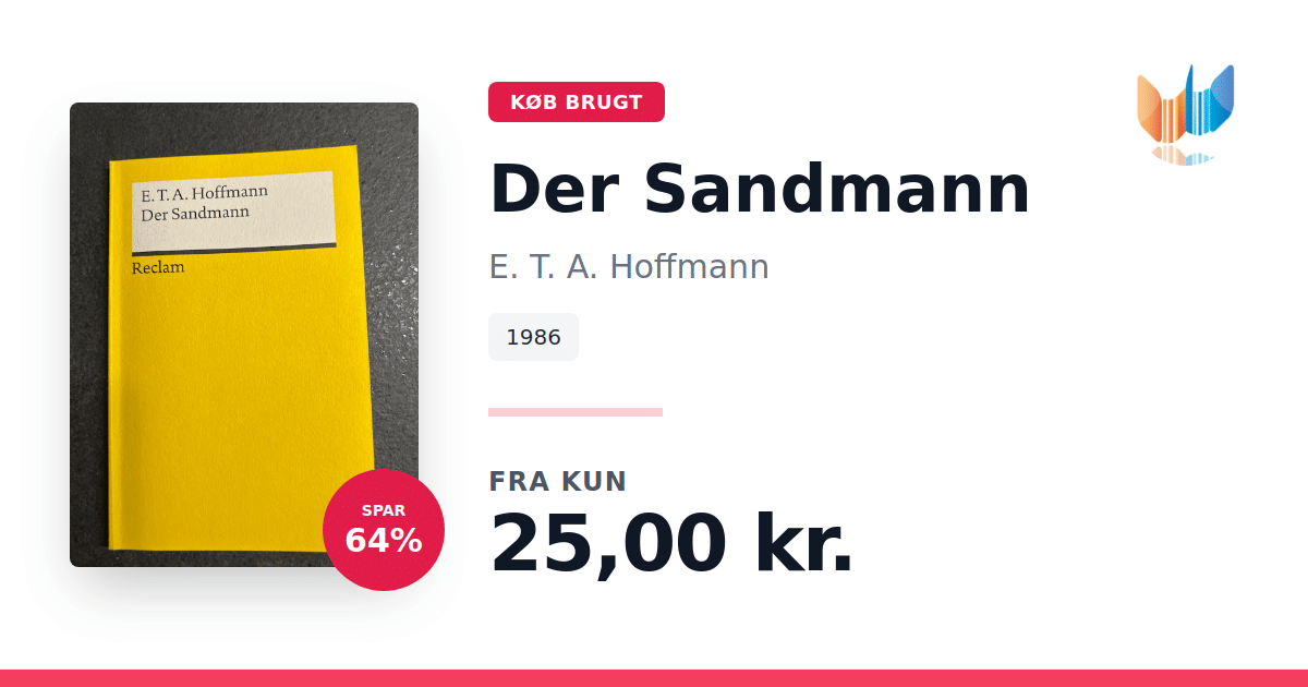 Lige nu kan du købe "Der Sandmann" af E. T. A. Hoffmann til kun 25,00 kr. Du sparer hele 64% af nyprisen! Bogen du ser her er brugt, og i god stand. Vi har i øjeblikket kun et enkelt eksemplar til salg af "Der Sandmann", så slå til mens du kan!