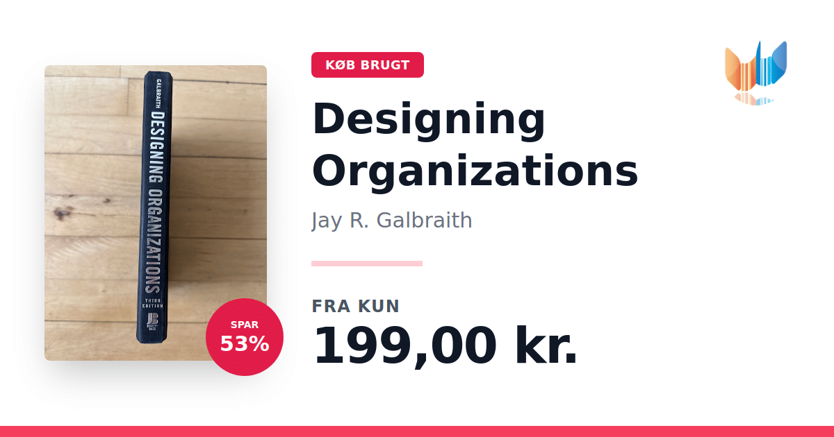 Lige nu kan du købe "Designing Organizations" af Jay R. Galbraith til kun 199,00 kr. Du sparer hele 57% af nyprisen! Bogen du ser her er brugt, og i perfekt stand. Vi har i øjeblikket 4 eksemplarer til salg af "Designing Organizations", så husk at se de forskellige udgaver.