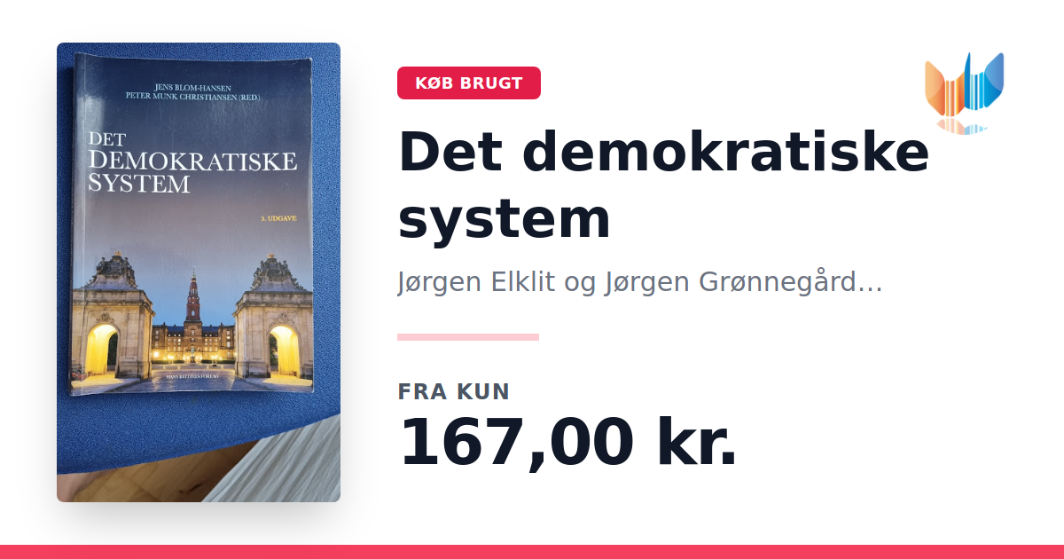 Lige nu kan du købe "Det demokratiske system" af Jørgen Elklit og Jørgen Grønnegård Christensen til kun 167,00 kr. Bogen du ser her er brugt, og i perfekt stand. Vi har i øjeblikket kun et enkelt eksemplar til salg af "Det demokratiske system", så slå til mens du kan!