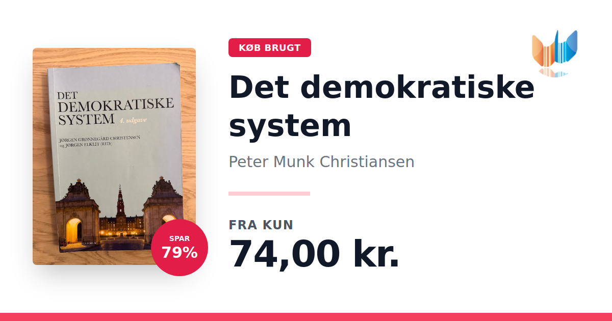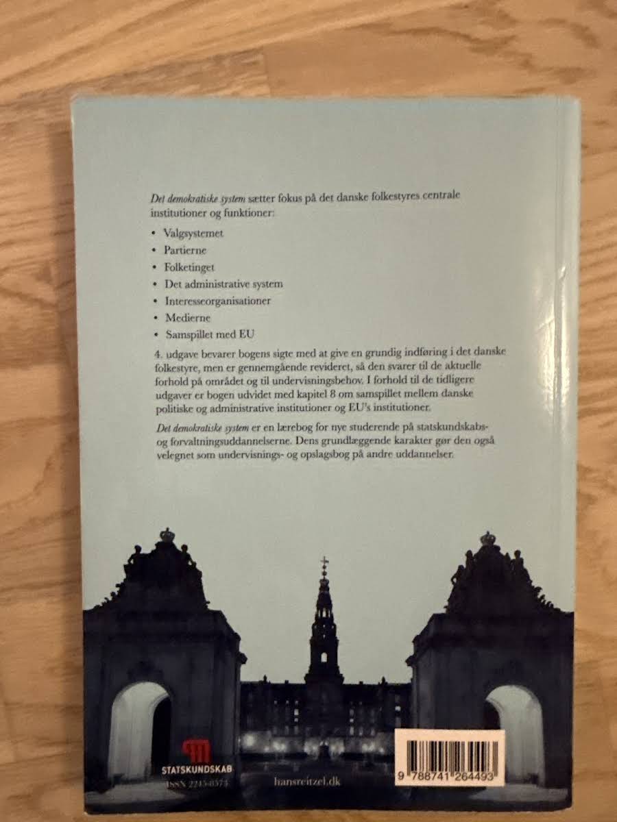 Det demokratiske system giver en indsigtsfuld gennemgang af hjørnestenene i det danske demokrati. Bogen dykker ned i væsentlige elementer som valgsystemet, de politiske partier, det parlamentariske system, den administrative struktur, interesseorganisationer, mediernes rolle og EU's betydning. I 4. udgave er bogens opbygning revideret for at afspejle de nyeste tendenser og undervisningsbehov. Den indeholder et udvidet kapitel om EU's struktur og funktion, hvilket gør den til et oplagt redskab for studerende på statskundskabs- og forvaltningsuddannelserne. Samtidig fungerer den som en alsidig undervisnings- og opslagsbog på tværs af andre uddannelsesretninger.