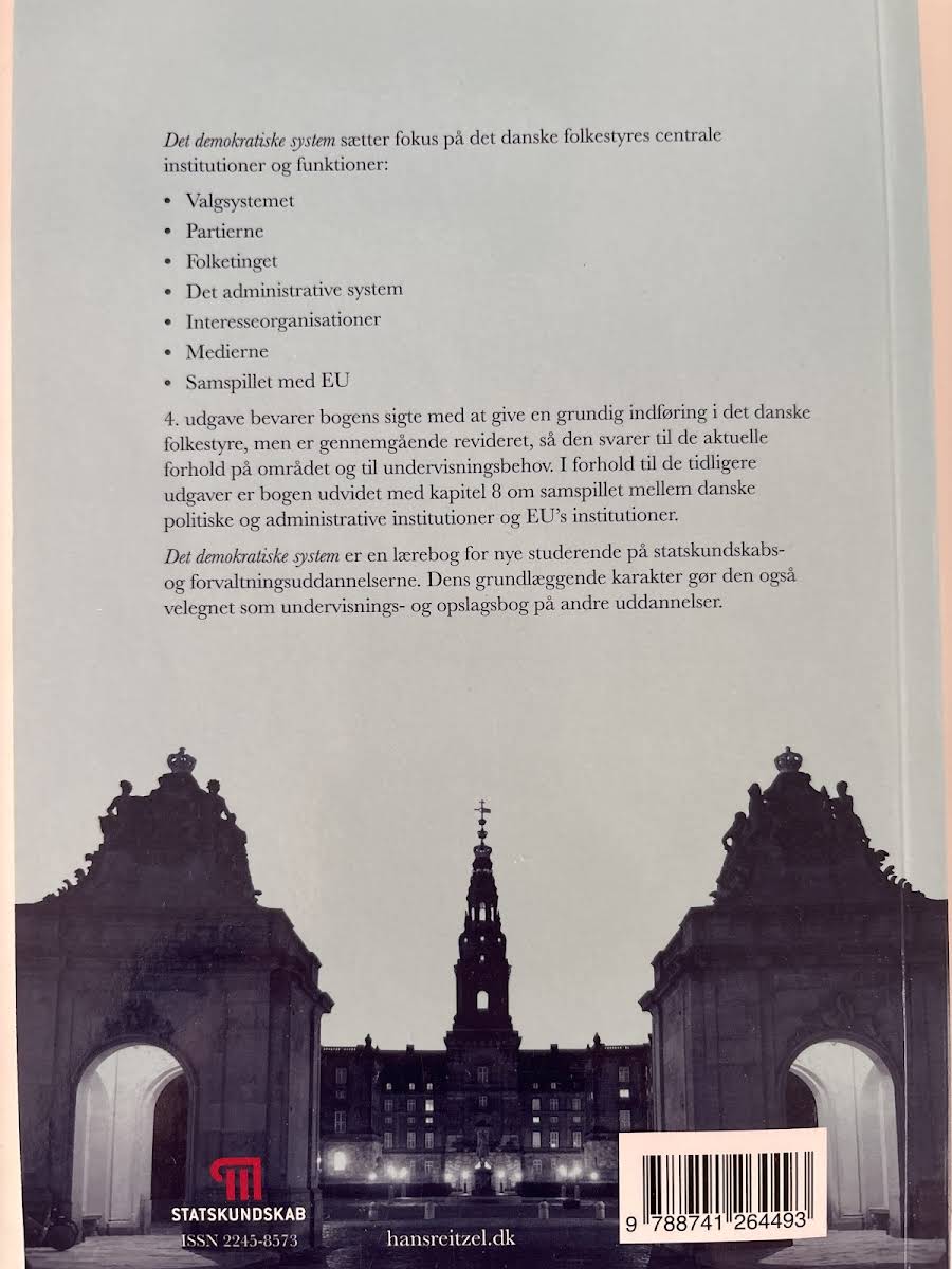 Det demokratiske system giver en indsigtsfuld gennemgang af hjørnestenene i det danske demokrati. Bogen dykker ned i væsentlige elementer som valgsystemet, de politiske partier, det parlamentariske system, den administrative struktur, interesseorganisationer, mediernes rolle og EU's betydning. I 4. udgave er bogens opbygning revideret for at afspejle de nyeste tendenser og undervisningsbehov. Den indeholder et udvidet kapitel om EU's struktur og funktion, hvilket gør den til et oplagt redskab for studerende på statskundskabs- og forvaltningsuddannelserne. Samtidig fungerer den som en alsidig undervisnings- og opslagsbog på tværs af andre uddannelsesretninger.