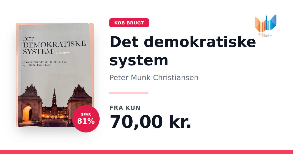 Lige nu kan du købe "Det demokratiske system" af Peter Munk Christiansen til kun 70,00 kr. Du sparer hele 81% af nyprisen! Bogen du ser her er brugt, og i god stand. Vi har i øjeblikket 6 eksemplarer til salg af "Det demokratiske system", så husk at se de forskellige udgaver.