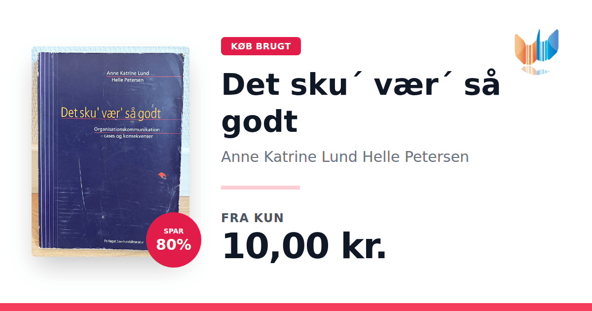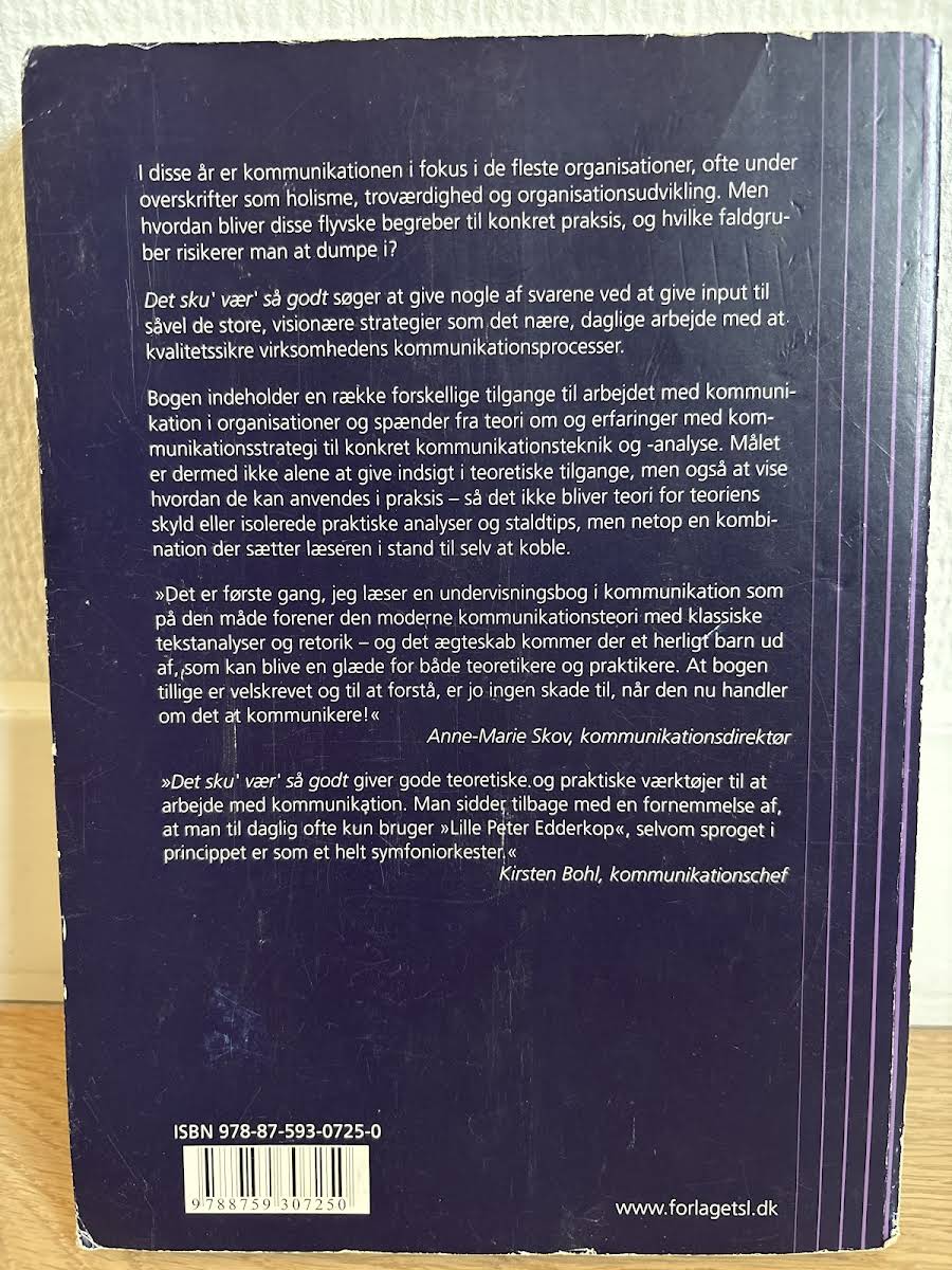 I Det sku' vær' så godt - organisationskommunikation - cases og konsekvenser dykker ned i, hvordan teori og praksis sammenvæves for at styrke den interne og eksterne kommunikation. Bogen præsenterer konkrete eksempler og udfordringer, som belyser de mange facetter af moderne organisationskommunikation. Med en kombination af cases, praktiske erfaringer og teoretiske overvejelser giver Anne Katrine Lund Helle Petersen et nuanceret billede af kommunikationsrollen. Diskussioner om holisme, troværdighed og strategiske overvejelser gør værket til en værdifuld ressource for alle, der ønsker at fordybe sig i, hvordan man omsætter flyvske begreber til håndgribelig praksis.