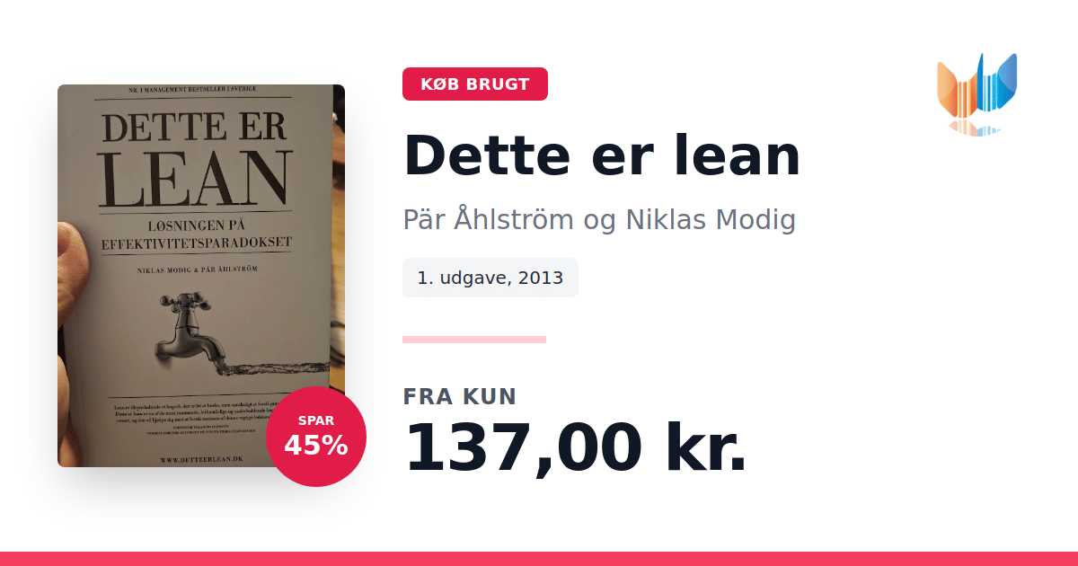 Lige nu kan du købe "Dette er lean" af Pär Åhlström og Niklas Modig til kun 137,00 kr. Du sparer hele 45% af nyprisen! Bogen du ser her er brugt, og i perfekt stand. Vi har i øjeblikket kun et enkelt eksemplar til salg af "Dette er lean", så slå til mens du kan!