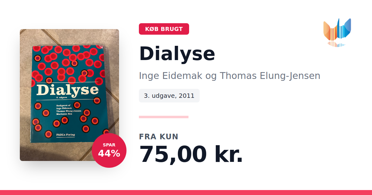 Lige nu kan du købe "Dialyse" af Inge Eidemak og Thomas Elung-Jensen til kun 75,00 kr. Du sparer hele 44% af nyprisen! Bogen du ser her er brugt, og i perfekt stand. Vi har i øjeblikket kun et enkelt eksemplar til salg af "Dialyse", så slå til mens du kan!