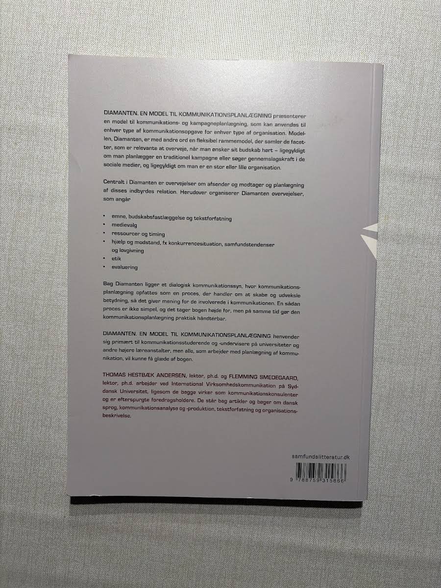 "Diamanten - en model til kommunikationsplanlægning" byder på et alsidigt redskab til systematisk planlægning af kommunikation og kampagner. Bogen introducerer den fleksible rammemodel, Diamanten, som samler de centrale facetter, der bør overvejes for at få sit budskab effektivt ud i verden – uanset om man arbejder med traditionelle kampagner eller søger gennemslagskraft via de sociale medier. Med fokus på både strategisk og praktisk anvendelse henvender værket sig primært til kommunikationsstuderende og undervisere, men den er også et værdifuldt redskab for alle, der beskæftiger sig med planlægning og implementering af kommunikation. Med sine 192 sider fra Samfundslitteratur (2012) stiller bogen skarpe værktøjer til rådighed for enhver, der ønsker at gøre en forskel med sit budskab.