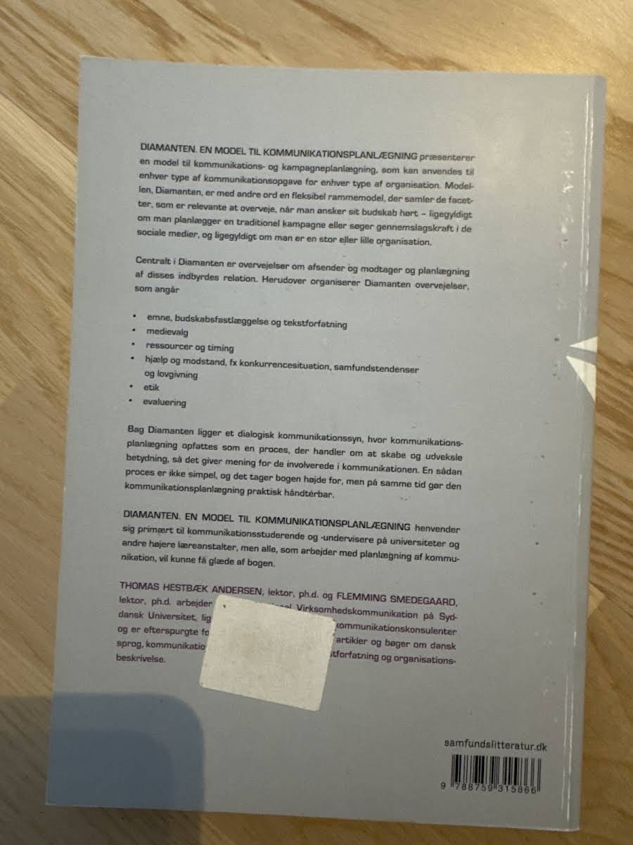 "Diamanten - en model til kommunikationsplanlægning" byder på et alsidigt redskab til systematisk planlægning af kommunikation og kampagner. Bogen introducerer den fleksible rammemodel, Diamanten, som samler de centrale facetter, der bør overvejes for at få sit budskab effektivt ud i verden – uanset om man arbejder med traditionelle kampagner eller søger gennemslagskraft via de sociale medier. Med fokus på både strategisk og praktisk anvendelse henvender værket sig primært til kommunikationsstuderende og undervisere, men den er også et værdifuldt redskab for alle, der beskæftiger sig med planlægning og implementering af kommunikation. Med sine 192 sider fra Samfundslitteratur (2012) stiller bogen skarpe værktøjer til rådighed for enhver, der ønsker at gøre en forskel med sit budskab.