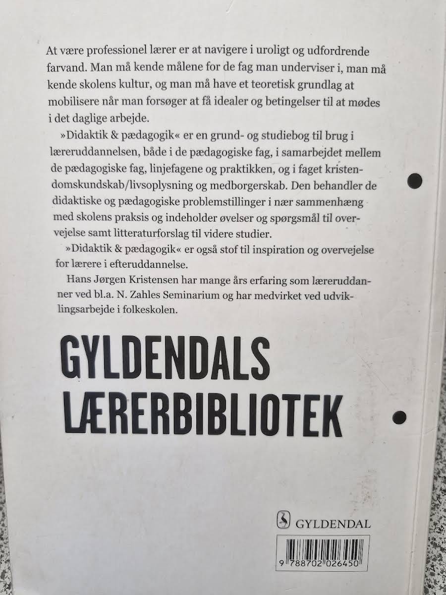 Didaktik & pædagogik af Hans Jørgen Kristensen udgivet af Gyldendal i 2007 er en grundbog for lærerstuderende, der ønsker at udforske både didaktiske og pædagogiske perspektiver i skolens hverdag. Bogen integrerer teori med praksis og sætter fokus på at forstå og håndtere de pædagogiske dilemmaer, der opstår i undervisningen. Bogen indeholder øvelser, refleksionsspørgsmål og litteraturforslag, der giver læseren mulighed for at dykke dybere ned i de didaktiske og pædagogiske spørgsmål. Med sin kombination af teoretisk indsigt og praktisk anvendelighed er denne grundbog et værdifuldt redskab for alle, der interesserer sig for skolens pædagogiske praksis.
