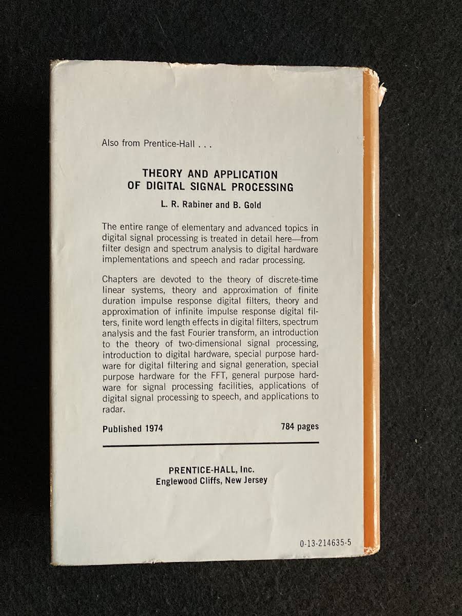 Digital Signal Processing by Alan V. Oppenheim (Author), Ronald W. Schafer (Author) ISBN-10: 0132146355 ISBN-13: 978-0132146357 1st Edition Publisher: Prentice Hall Inc. Publication date: January 12, 1975