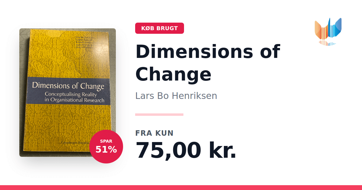 Lige nu kan du købe "Dimensions of Change" af Lars Bo Henriksen til kun 75,00 kr. Du sparer hele 51% af nyprisen! Bogen du ser her er brugt, og i god stand. Vi har i øjeblikket kun et enkelt eksemplar til salg af "Dimensions of Change", så slå til mens du kan!