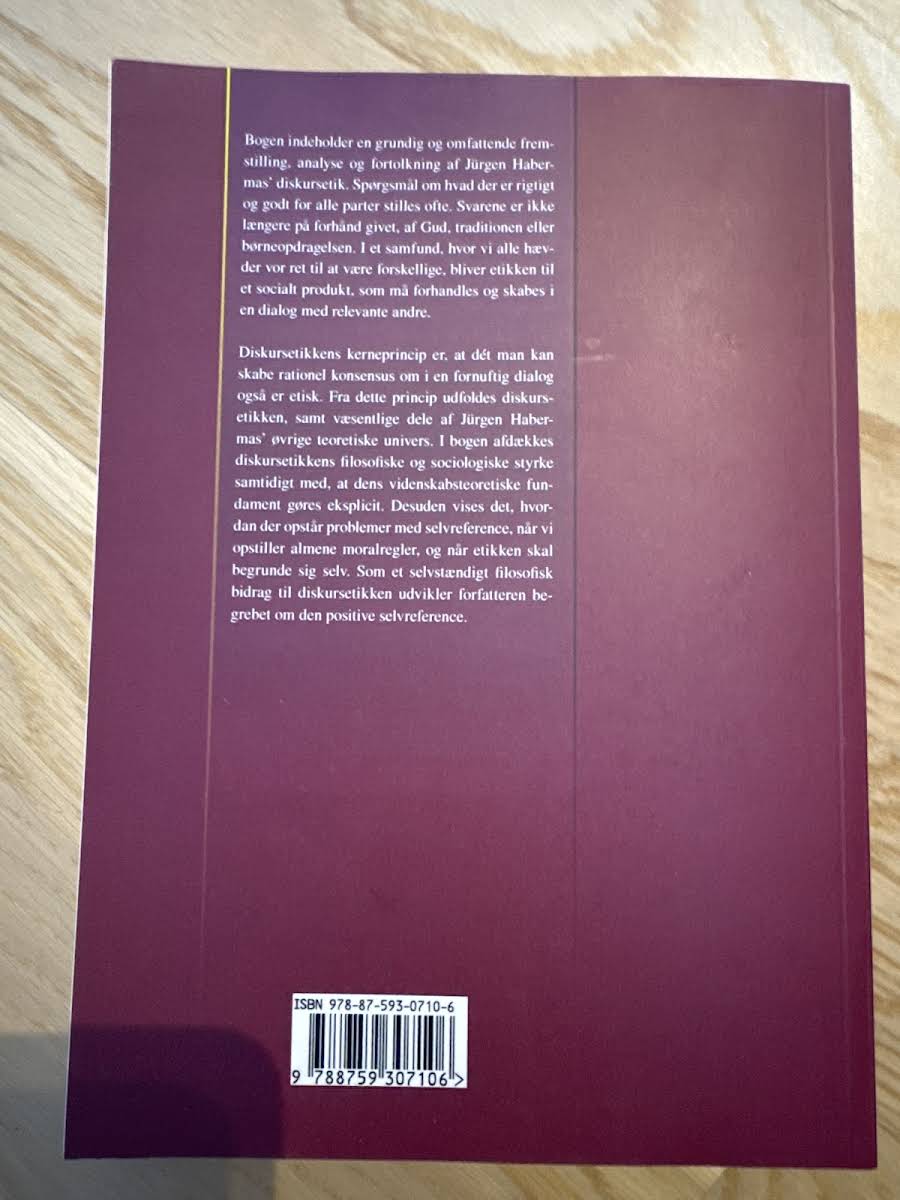 Diskursetik og den positive selvreference tilbyder en dybdegående og nuanceret fremstilling af Jürgen Habermas’ diskursetik. Bogen stiller de centrale spørgsmål om, hvad der er rigtigt og godt for alle parter, og udforsker, hvordan etikken kan blive et forhandlet og dynamisk produkt i en moderne dialog, hvor autoriteter som Gud, tradition eller opdragelse ikke længere dikterer svarene. I værket afdækkes diskursetikkens filosofiske og sociologiske ressourcer, idet forfatteren gør det videnskabsteoretiske fundament eksplicit og tydeligt. Desuden belyser bogen de problemer, der opstår i forbindelse med selvreference, når man opstiller almene moralregler og forsøger at begrunde etikken på egen hånd. Som et selvstændigt bidrag til diskursetikkens udvikling introducerer Anders Bordum begrebet om den positive selvreference og tilbyder nye perspektiver på, hvordan rationel konsensus i dialog kan danne grundlag for etik.