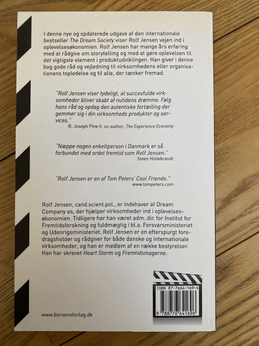 Seks år efter debuten vender Rolf Jensen tilbage med Dream Society - træd ind i oplevelsesøkonomien i en revideret 2. udgave. Udover en grundig status på de tendenser, der har formet oplevelsesøkonomien, indeholder denne udgave et helt nyt kapitel, der kortlægger de seneste udviklinger. Med solid erfaring som rådgiver i storytelling viser Jensen, hvordan virksomheder skal omstille sig til en verden, hvor oplevelser er den nye valuta. Han analyserer morgendagens forbrugsmønstre og giver praktiske anbefalinger til strategisk produktudvikling, branding og ledelse. Dream Society er en håndbog for topledere, beslutningstagere og alle, der ønsker at forstå de grundlæggende mekanismer i det 21. århundredes økonomi. Bogen illustrerer, hvordan man skaber værdi og meningsfulde forbindelser gennem engagerende historier og unikke oplevelser. Udgivet af Børsen i 2006 som hardcover og spænder over 215 sider. Denne 2. udgave er uundværlig for dem, der vil være på forkant med oplevelsesøkonomiens udfordringer og muligheder.