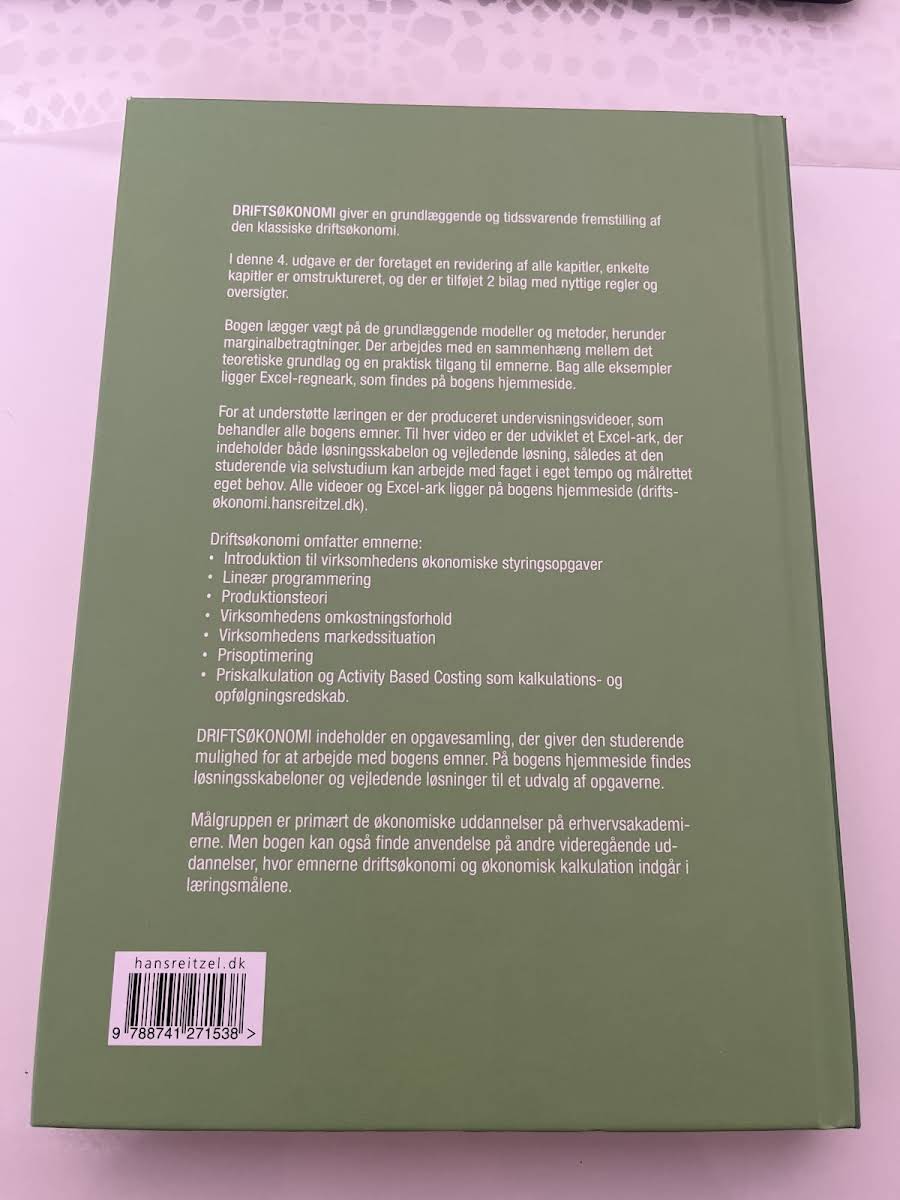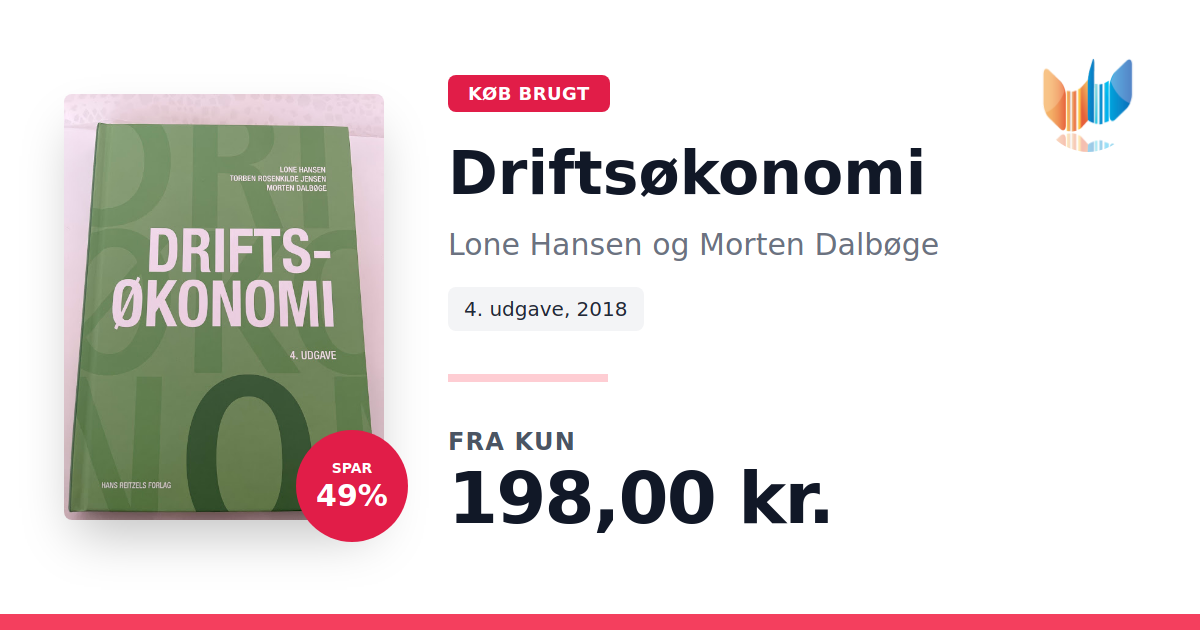 "Driftsøkonomi" (4. udgave) af Lone Hansen, Morten Dalbøge og Torben Rosenkilde Jensen præsenterer en grundlæggende og tidssvarende introduktion til fagets centrale modeller og metoder. Bogen integrerer både teoretiske perspektiver og praktiske anvendelser, hvor de metodiske overvejelser understøttes af illustrative eksempler, der giver den studerende mulighed for at se den teoretiske ramme omsat til praksis. I denne udgave er alle kapitler revideret og omstruktureret for at reflektere den økonomiske virkelighed. Bogen omfatter nøgleemner som virksomhedens økonomiske styring, omkostningsforhold, prisoptimering, prisberegning samt Activity Based Costing. Understøttende undervisningsmateriale, herunder video-forelæsninger og øvelser med tilhørende Excel-ark, hjælper med at gøre stoffet tilgængeligt og let at arbejde med for studerende på de erhvervsøkonomiske uddannelser samt andre relaterede studieområder.