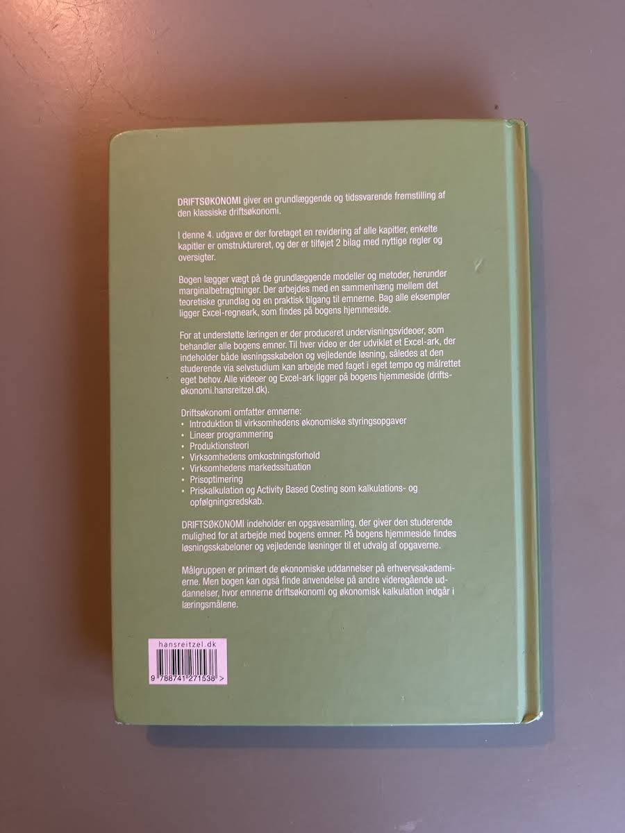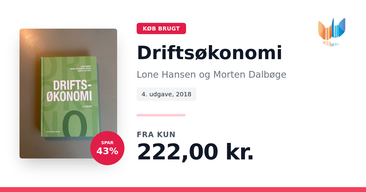 "Driftsøkonomi" (4. udgave) af Lone Hansen, Morten Dalbøge og Torben Rosenkilde Jensen præsenterer en grundlæggende og tidssvarende introduktion til fagets centrale modeller og metoder. Bogen integrerer både teoretiske perspektiver og praktiske anvendelser, hvor de metodiske overvejelser understøttes af illustrative eksempler, der giver den studerende mulighed for at se den teoretiske ramme omsat til praksis. I denne udgave er alle kapitler revideret og omstruktureret for at reflektere den økonomiske virkelighed. Bogen omfatter nøgleemner som virksomhedens økonomiske styring, omkostningsforhold, prisoptimering, prisberegning samt Activity Based Costing. Understøttende undervisningsmateriale, herunder video-forelæsninger og øvelser med tilhørende Excel-ark, hjælper med at gøre stoffet tilgængeligt og let at arbejde med for studerende på de erhvervsøkonomiske uddannelser samt andre relaterede studieområder.