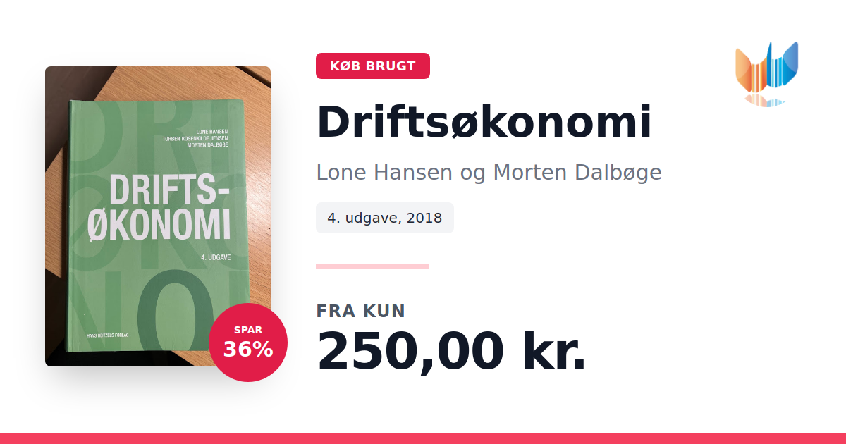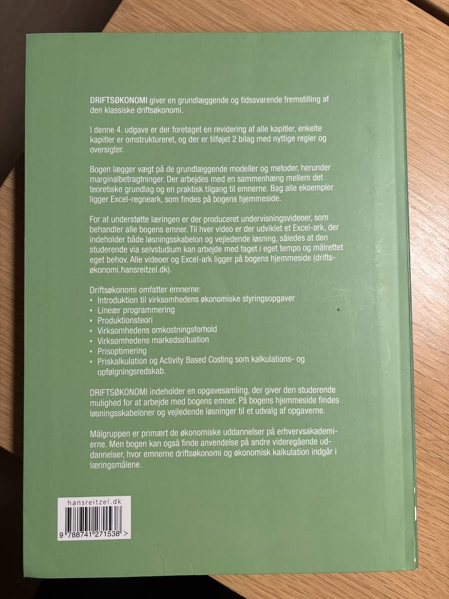 "Driftsøkonomi" (4. udgave) af Lone Hansen, Morten Dalbøge og Torben Rosenkilde Jensen præsenterer en grundlæggende og tidssvarende introduktion til fagets centrale modeller og metoder. Bogen integrerer både teoretiske perspektiver og praktiske anvendelser, hvor de metodiske overvejelser understøttes af illustrative eksempler, der giver den studerende mulighed for at se den teoretiske ramme omsat til praksis. I denne udgave er alle kapitler revideret og omstruktureret for at reflektere den økonomiske virkelighed. Bogen omfatter nøgleemner som virksomhedens økonomiske styring, omkostningsforhold, prisoptimering, prisberegning samt Activity Based Costing. Understøttende undervisningsmateriale, herunder video-forelæsninger og øvelser med tilhørende Excel-ark, hjælper med at gøre stoffet tilgængeligt og let at arbejde med for studerende på de erhvervsøkonomiske uddannelser samt andre relaterede studieområder.