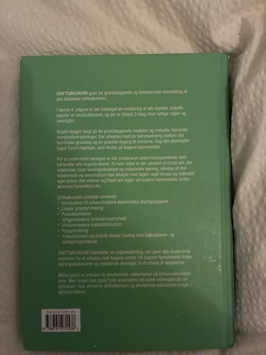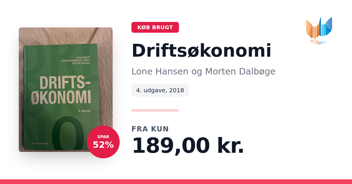"Driftsøkonomi" (4. udgave) af Lone Hansen, Morten Dalbøge og Torben Rosenkilde Jensen præsenterer en grundlæggende og tidssvarende introduktion til fagets centrale modeller og metoder. Bogen integrerer både teoretiske perspektiver og praktiske anvendelser, hvor de metodiske overvejelser understøttes af illustrative eksempler, der giver den studerende mulighed for at se den teoretiske ramme omsat til praksis. I denne udgave er alle kapitler revideret og omstruktureret for at reflektere den økonomiske virkelighed. Bogen omfatter nøgleemner som virksomhedens økonomiske styring, omkostningsforhold, prisoptimering, prisberegning samt Activity Based Costing. Understøttende undervisningsmateriale, herunder video-forelæsninger og øvelser med tilhørende Excel-ark, hjælper med at gøre stoffet tilgængeligt og let at arbejde med for studerende på de erhvervsøkonomiske uddannelser samt andre relaterede studieområder.