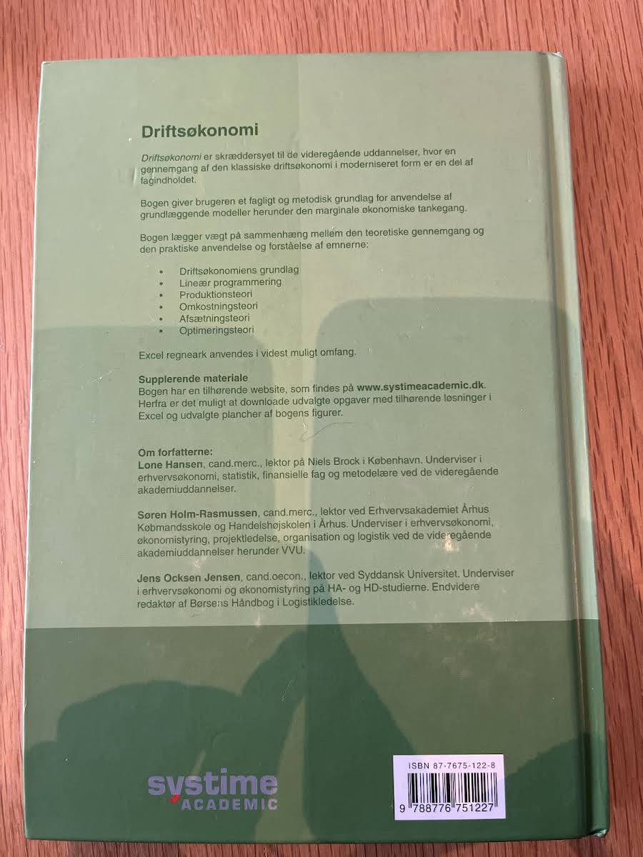 Driftsøkonomi er en lærebog, der tilbyder en grundlæggende og opdateret introduktion til den klassiske driftsøkonomi. Bogen henvender sig især til studerende på akademiuddannelser med indslag af erhvervsøkonomi, eksempelvis inden for Finansøkonomi og Markedsføringsøkonomi, men er samtidig velegnet til andre kursusformer, hvor et solidt fundament i driftsøkonomiske modeller er essentielt. Indholdet rummer centrale elementer som produktionsteori, omkostningsteori, afsætningsteori og optimeringsteori, idet bogen lægger vægt på den marginale økonomiske tankegang. Gennem en kombination af teoretiske gennemgange og praktiske anvendelser, blandt andet med udstrakt brug af Excel-regneark, opfordres læseren til at opnå en dybere forståelse af de grundlæggende modeller og metoder, der styrer driftsøkonomiens felt.