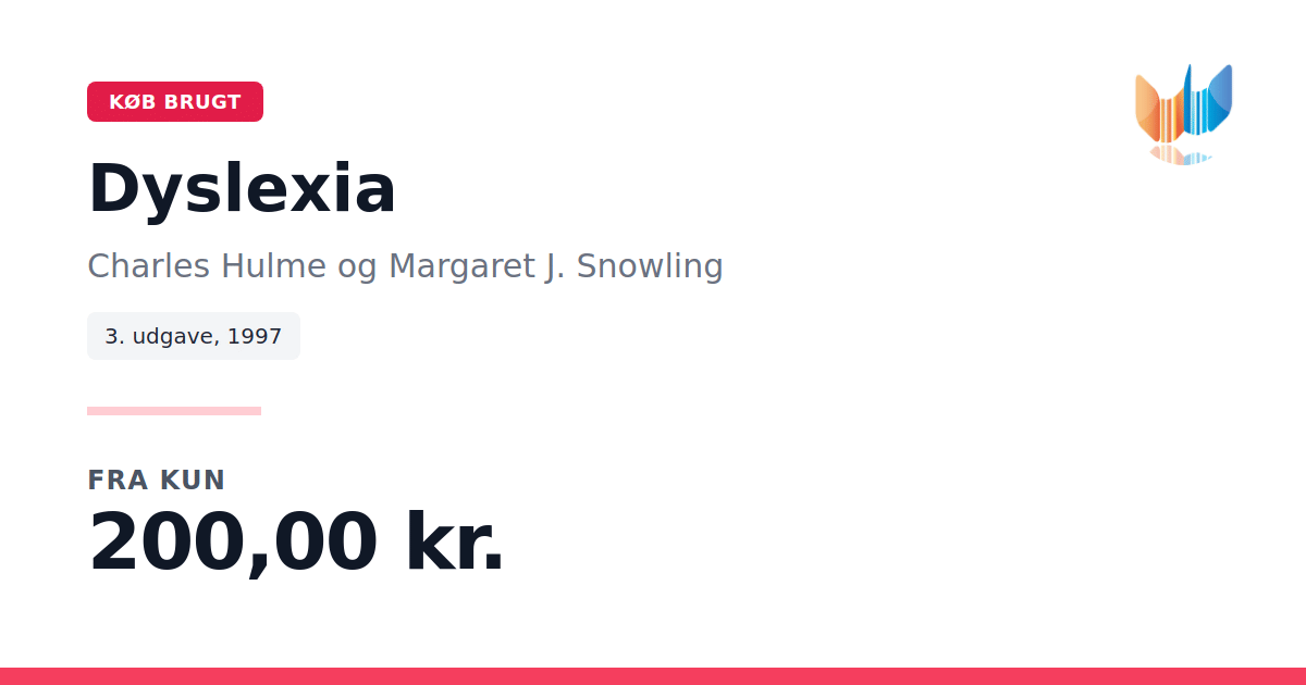 Lige nu kan du købe "Dyslexia" af Charles Hulme og Margaret J. Snowling til kun 200,00 kr. Du sparer hele 53% af nyprisen! Bogen du ser her er brugt, og i perfekt stand. Vi har i øjeblikket kun et enkelt eksemplar til salg af "Dyslexia", så slå til mens du kan!