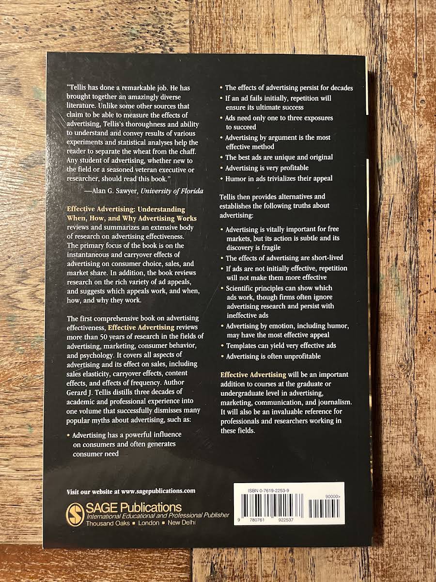 Effective Advertising distills decades of academic and professional expertise into a comprehensive exploration of the mechanisms that drive advertising success. Gerard J. Tellis reviews over 50 years of research from advertising, marketing, consumer behavior, and psychology to illuminate the instantaneous and carryover effects of advertising on consumer choice, sales, and market share. With a rigorous analysis of the variety of ad appeals and their corresponding effects, the book challenges popular misconceptions - reassessing ideas about repeat exposures, the longevity of advertising impacts, and the myth that unique ads inherently outperform conventional ones. Tellis demonstrates that while advertising is essential in free markets, its influence is often subtle and ephemeral. This accessible yet meticulously researched work is ideal for students, seasoned professionals, and researchers looking to deepen their understanding of advertising's true effectiveness.