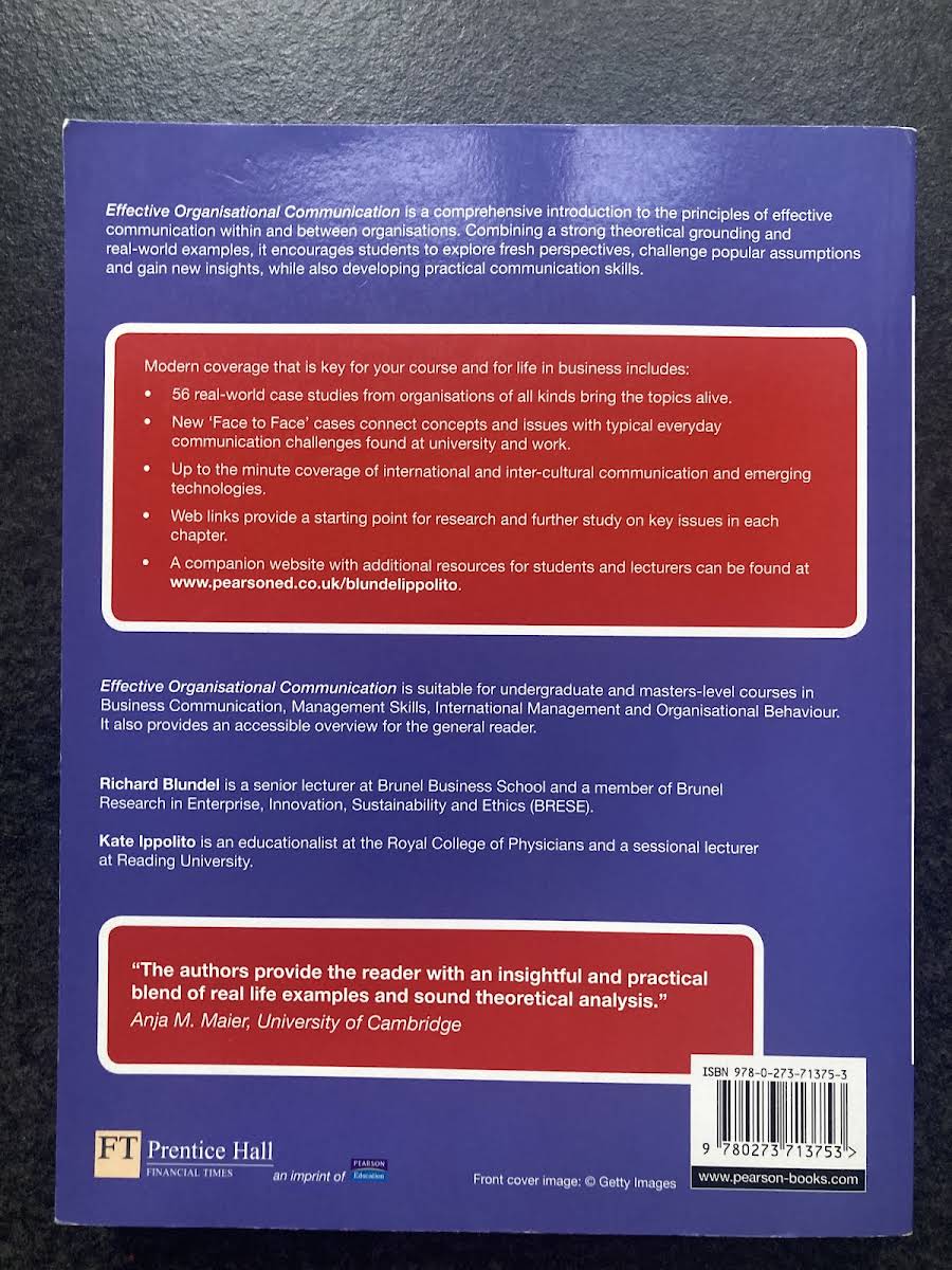 Effective Organisational Communication: Perspectives, Principles and Practices af Richard Blundel og Kate Ippolito er en grundig og tilgængelig indføring i, hvordan effektiv kommunikation skabes og udvikles i en ledelseskontekst. Med et kritisk blik udforsker forfatterne kommunikationens rolle i moderne organisationer og giver læseren et solidt teoretisk fundament. Bogen er opdelt i to hoveddele. Første del præsenterer centrale principper, modeller og perspektiver på organisatorisk kommunikation, mens anden del zoomer ind på de praktiske redskaber og metoder, der kan anvendes i daglig ledelses- og teamkommunikation. Med cases, øvelser og konkrete eksempler illustrerer forfatterne, hvordan strategisk planlægning og målrettet formidling kan styrke samarbejde, forandringsprocesser og intern dialog. Hvert kapitel afsluttes med refleksionsspørgsmål og handlingsanvisninger, der udfordrer læseren til at omsætte teori til praksis. Denne paperback-udgave fra Pearson Education (2008) på 452 sider henvender sig til både studerende på ledelses- og kommunikationsuddannelser og praktikere, der ønsker at optimere deres kommunikationskompetencer i organisationssammenhænge.