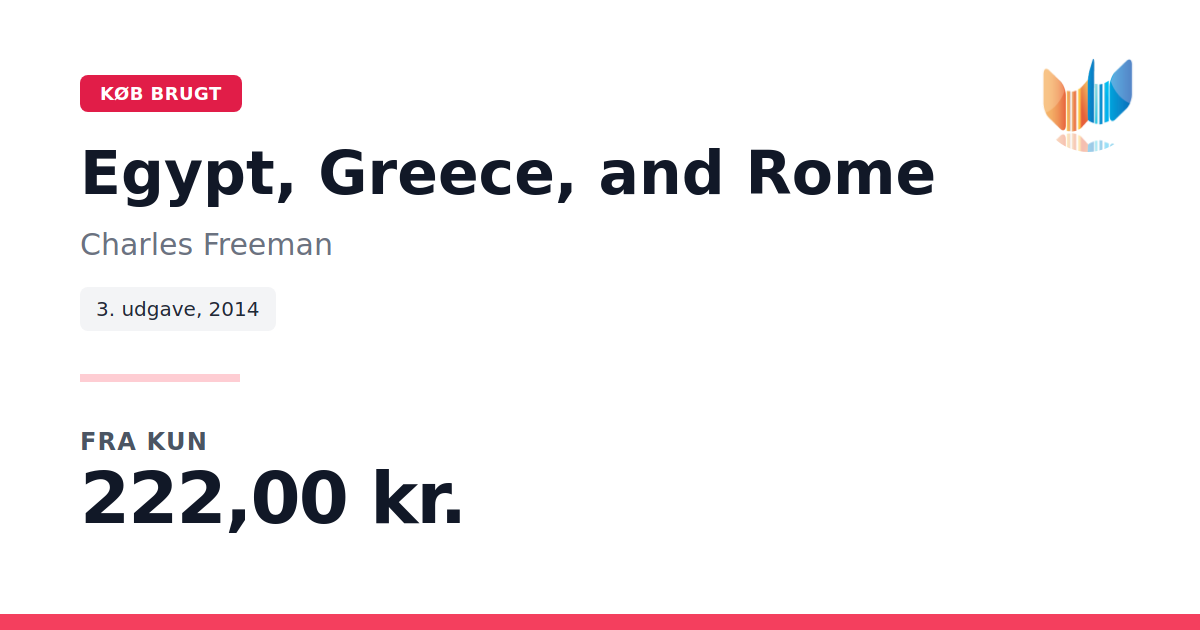 Lige nu kan du købe "Egypt, Greece, and Rome" af Charles Freeman til kun 222,00 kr. Du sparer hele 47% af nyprisen! Bogen du ser her er brugt, og i god stand. Vi har i øjeblikket kun et enkelt eksemplar til salg af "Egypt, Greece, and Rome", så slå til mens du kan!