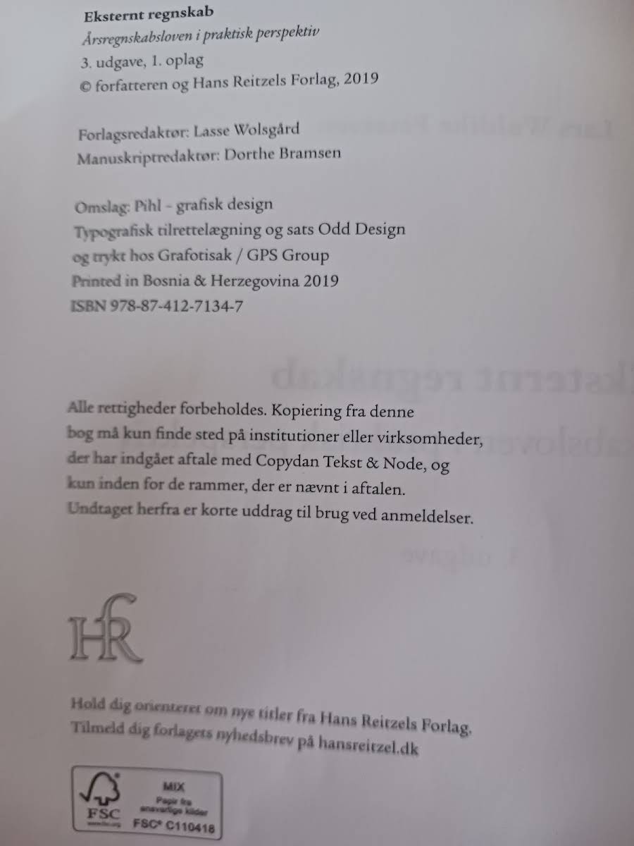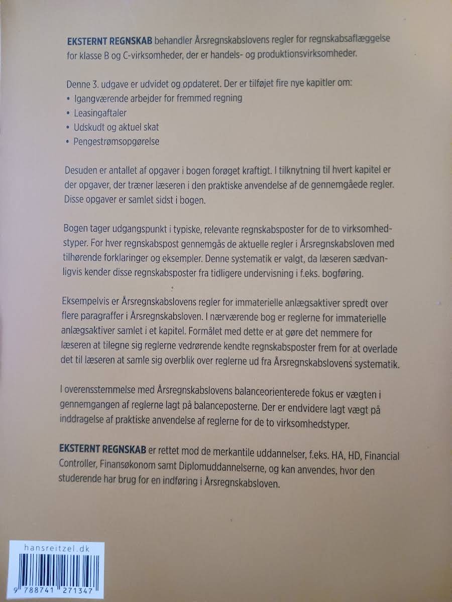 Denne tredje udgave af Eksternt regnskab giver en opdateret og udvidet gennemgang af Årsregnskabslovens regler, med særligt henblik på klasse B og C-virksomheder inden for handels- og produktionssektoren. Bogen indeholder fire nye kapitler, der blandt andet behandler igangværende arbejder for fremmed regning, leasingaftaler, udskudt og aktuel skat samt pengestrømsopgørelser. Med udgangspunkt i velkendte regnskabsposter præsenteres de relevante regler i Årsregnskabsloven med ledsagende forklaringer og eksempler, så læseren nemt kan følge med i de balanceorienterede bestemmelser. Hvert kapitel suppleres med praktiske opgaver, som bidrager til en dybere forståelse af, hvordan lovens krav omsættes til det praktiske regnskabsarbejde. Bogen henvender sig til studerende på merkantile uddannelser samt praktikere, der har behov for en grundig indføring i Årsregnskabslovens rammer og anvendelse. Den eventuelle kombination af teoretisk viden og praktiske øvelser gør den til et uundværligt værktøj for alle, der ønsker et solidt kendskab til eksternt regnskab.