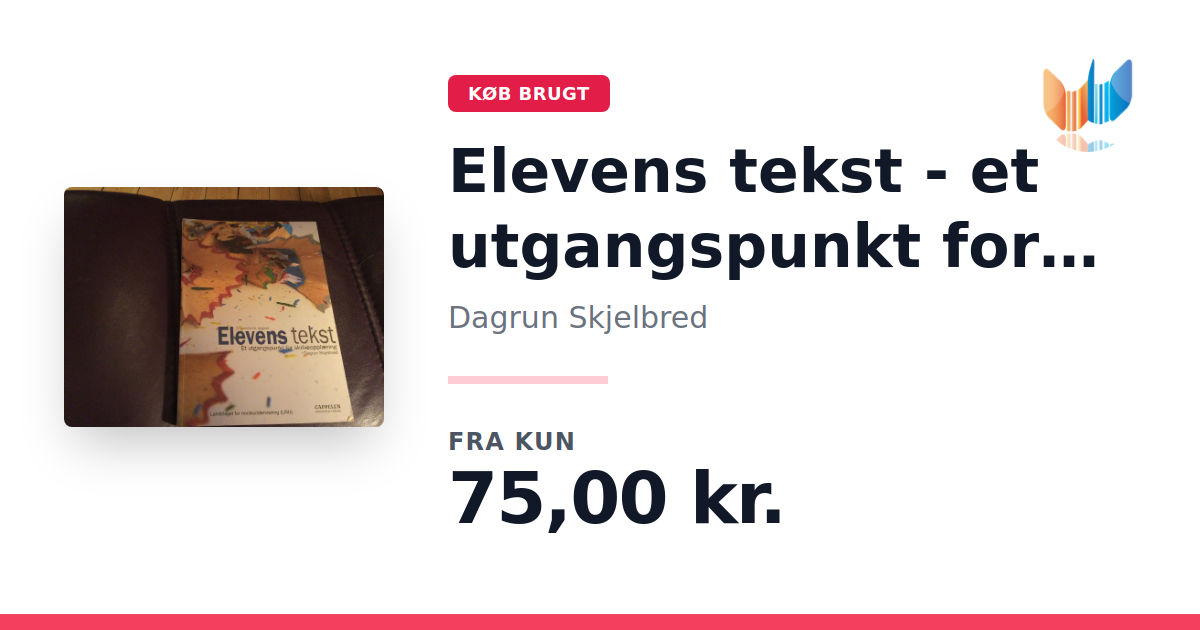Lige nu kan du købe "Elevens tekst - et utgangspunkt for skriveopplæring" af Dagrun Skjelbred til kun 75,00 kr. Bogen du ser her er brugt, og i perfekt stand. Vi har i øjeblikket 3 eksemplarer til salg af "Elevens tekst", så husk at se de forskellige udgaver.