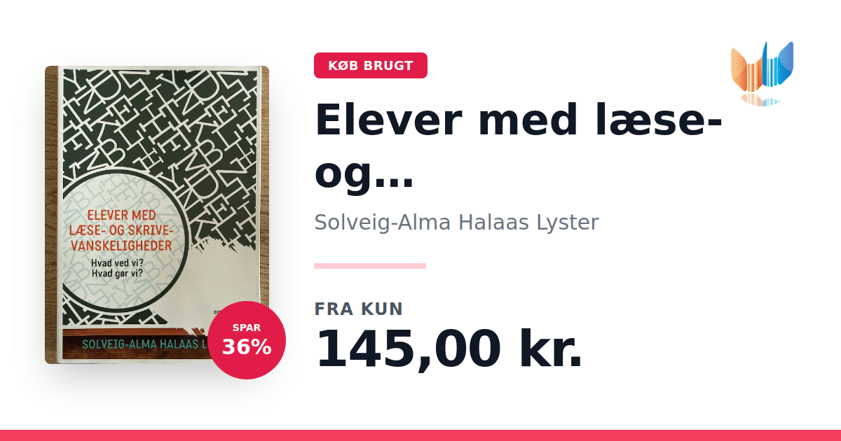 Lige nu kan du købe "Elever med læse- og skrivevanskeligheder" af Solveig-Alma Halaas Lyster til kun 145,00 kr. Du sparer hele 36% af nyprisen! Bogen du ser her er brugt, og i perfekt stand. Vi har i øjeblikket kun et enkelt eksemplar til salg af "Elever med læse- og skrivevanskeligheder", så slå til mens du kan!