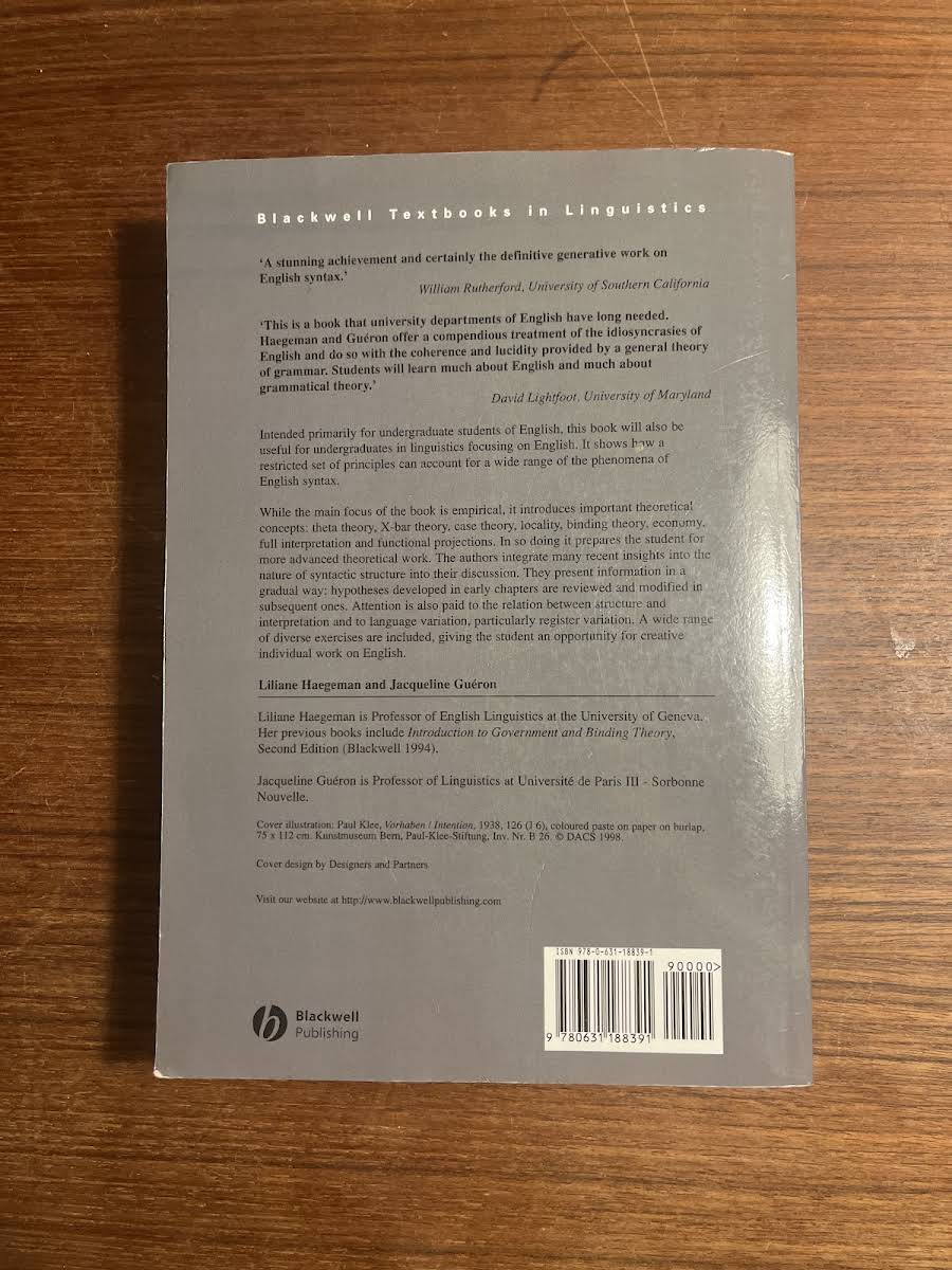 English Grammar, authored by Liliane Haegeman and Jacqueline Guéron, is primarily designed for undergraduate students pursuing English studies, though it also serves as a valuable resource for linguistics students with an interest in the English language. The book presents a concise set of principles that effectively account for a wide range of phenomena in English syntax. While its main focus is empirical, the work introduces pivotal theoretical concepts such as theta-theory, X-bar theory, case theory, locality, binding theory, economy, full interpretation, and functional projections. These ideas are carefully developed throughout the chapters, with earlier hypotheses being evaluated and refined as the discussion progresses. Complementing its rigorous theoretical framework, English Grammar includes a diverse array of exercises that invite students to engage in creative, individual exploration of English syntax. This methodical approach provides a solid foundation for those preparing to undertake more advanced theoretical studies.