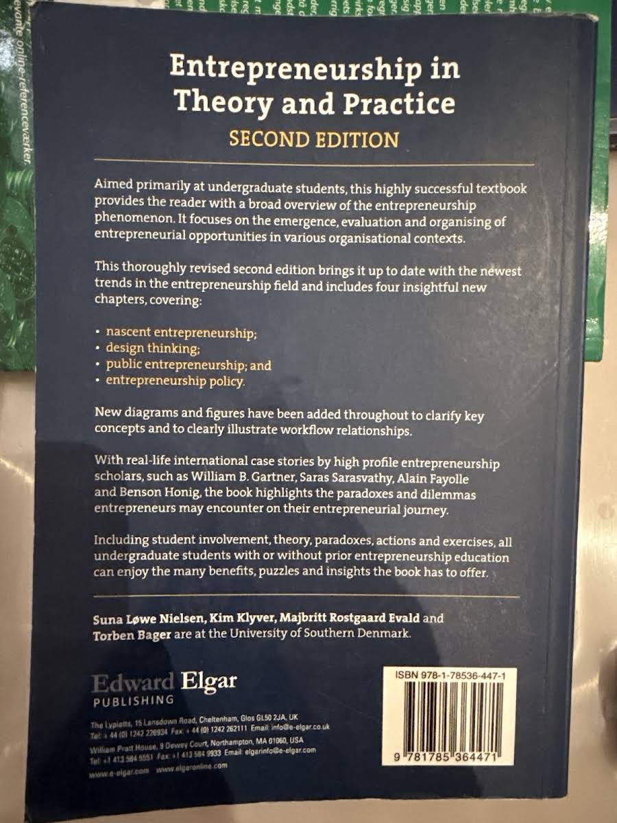 Bogen Entrepreneurship in Theory and Practice af Suna Lowe Nielsen er en grundlæggende introduktion til entreprenørskab for videregående uddannelser. Den giver en bred oversigt over entreprenørskabsfænomener og fokuserer på tilblivelse, vurdering og organisering af entreprenørielle muligheder i forskellige organisatoriske rammer. Gennem klare figurer og diagrammer præsenteres centrale begreber og arbejdsprocesser, så læseren nemt kan bevæge sig fra teori til praksis. Internationale case-eksempler belyser de paradokser og dilemmaer, entreprenører ofte møder på deres rejse. Med en kombination af teori, praktiske øvelser og handlingsorienterede tilgange henvender bogen sig til alle studerende - både med og uden forudgående kendskab til entreprenørskab. Paperbackudgaven fra 2017 rummer 384 sider og fungerer som et solidt grundlag for bachelorstudier i entreprenørskab.