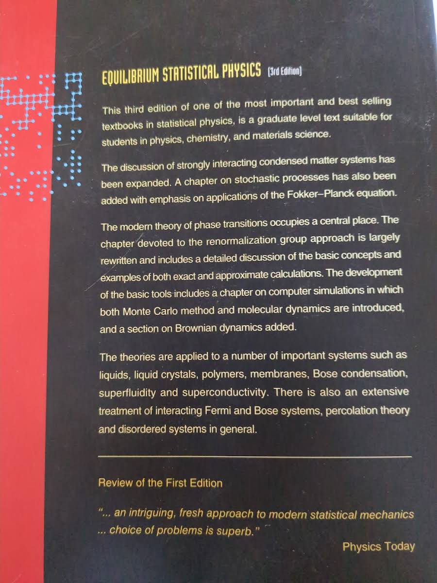 Denne tredje udgave af Equilibrium Statistical Physics af Michael Plischke og Birger Bergersen er et centralt undervisningsværk for kandidatstuderende i fysik, kemi og materialvidenskab. Bogen, udgivet i 2006, bygger videre på tidligere udgaver med et omfattende pensum og tydelig teoretisk fundering. Diskussionen af stærkt vekselvirkende kondenserede materiesystemer er udvidet med dybdegående analyser af mean field- og Landau-teorier. Et nyt kapitel om stokastiske processer introducerer Fokker-Planck-ligningen med vægt på praktiske anvendelser i komplekse systemer. Den moderne teori for fasetransitioner fylder en central plads, og det omarbejdede afsnit om renormaliseringsgruppen forklarer grundlæggende begreber gennem både eksakte og approksimerede beregninger. Denne del giver læseren et solidt greb om kritiske fænomener. Grundlæggende værktøjer præsenteres i en udvidet gennemgang af computersimuleringer, hvor både Monte Carlo-metoder, molekylær dynamik og Brownsk dynamik bliver gennemgået trin for trin. Anvendelserne omfatter væsker, flydende krystaller, polymerer, membraner, Bosekondensering, superfluiditet og superconductivitet. Desuden behandles interagerende Fermi- og Bose-systemer, perkolationsteori og vilkårlige, forstyrrede systemer på et højt fagligt niveau.