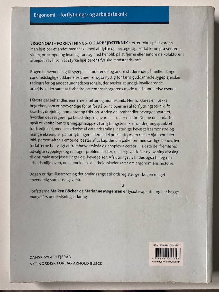Ergonomi – Forflytnings- og arbejdsteknik giver en grundlæggende forståelse for, hvordan korrekt bevægelse og forflytning kan fremme patientens velbefindende og samtidig forebygge arbejdsskader. Bogen præsenterer en række velafprøvede teknikker og løsningsforslag, som understøtter sundhedspersonalets hverdag og forbedrer den praktiske tilgang til forflytningsopgaver. Med sine mange detaljerede illustrationer og et omfattende indeks fungerer lærebogen som et værdifuldt opslagsværk for studerende inden for sygepleje og andre sundhedsfag. Forfatterne Marianne Mogensen og Maiken Böcher, er erfarne fysioterapeuter og undervisere, hvilket sikrer en solid og pædagogisk formidling af emnet.