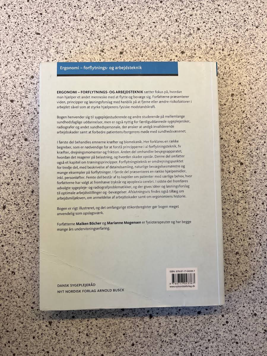 Ergonomi – Forflytnings- og arbejdsteknik giver en grundlæggende forståelse for, hvordan korrekt bevægelse og forflytning kan fremme patientens velbefindende og samtidig forebygge arbejdsskader. Bogen præsenterer en række velafprøvede teknikker og løsningsforslag, som understøtter sundhedspersonalets hverdag og forbedrer den praktiske tilgang til forflytningsopgaver. Med sine mange detaljerede illustrationer og et omfattende indeks fungerer lærebogen som et værdifuldt opslagsværk for studerende inden for sygepleje og andre sundhedsfag. Forfatterne Marianne Mogensen og Maiken Böcher, er erfarne fysioterapeuter og undervisere, hvilket sikrer en solid og pædagogisk formidling af emnet.