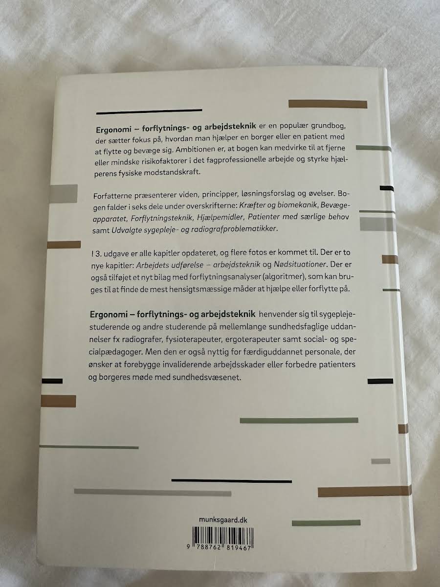 Ergonomi er en grundbog, der sætter fokus på, hvordan fagpersoner sikrer en sikker og effektiv måde at flytte og støtte borgere og patienter på. Bogen sigter mod at reducere de risikofaktorer, der kan opstå i det faglige arbejde, og samtidig styrke hjælperens fysiske robusthed. I denne 3. udgave præsenterer forfatterne Maiken Böcher og Marianne Mogensen opdateret viden, principper, løsningsforslag og en række praktiske øvelser. Værket er struktureret i seks hoveddele, herunder temaer som kræfter og biomekanik, bevægeapparatet, forflytningsteknik, hjælpemidler, og patienter med særlige behov samt udvalgte problematikker inden for sygepleje og radiografi. Opdateringerne i denne udgave omfatter friske fotografier og to nye kapitler om Arbejdets udførelse – arbejdsteknik og Nødsituationer. Derudover er et nyt bilag med forflytningsanalyser blevet tilføjet, som tilbyder et praktisk redskab til at identificere de mest hensigtsmæssige metoder til forflytning. Bogen henvender sig primært til sygeplejestuderende og andre studerende på de mellemlange sundhedsfaglige uddannelser som radiografer, fysioterapeuter, ergoterapeuter samt social- og specialpædagoger, men den er også et værdifuldt redskab for fagpersoner, der ønsker at forebygge arbejdsskader og forbedre interaktionen med patienter og borgere.