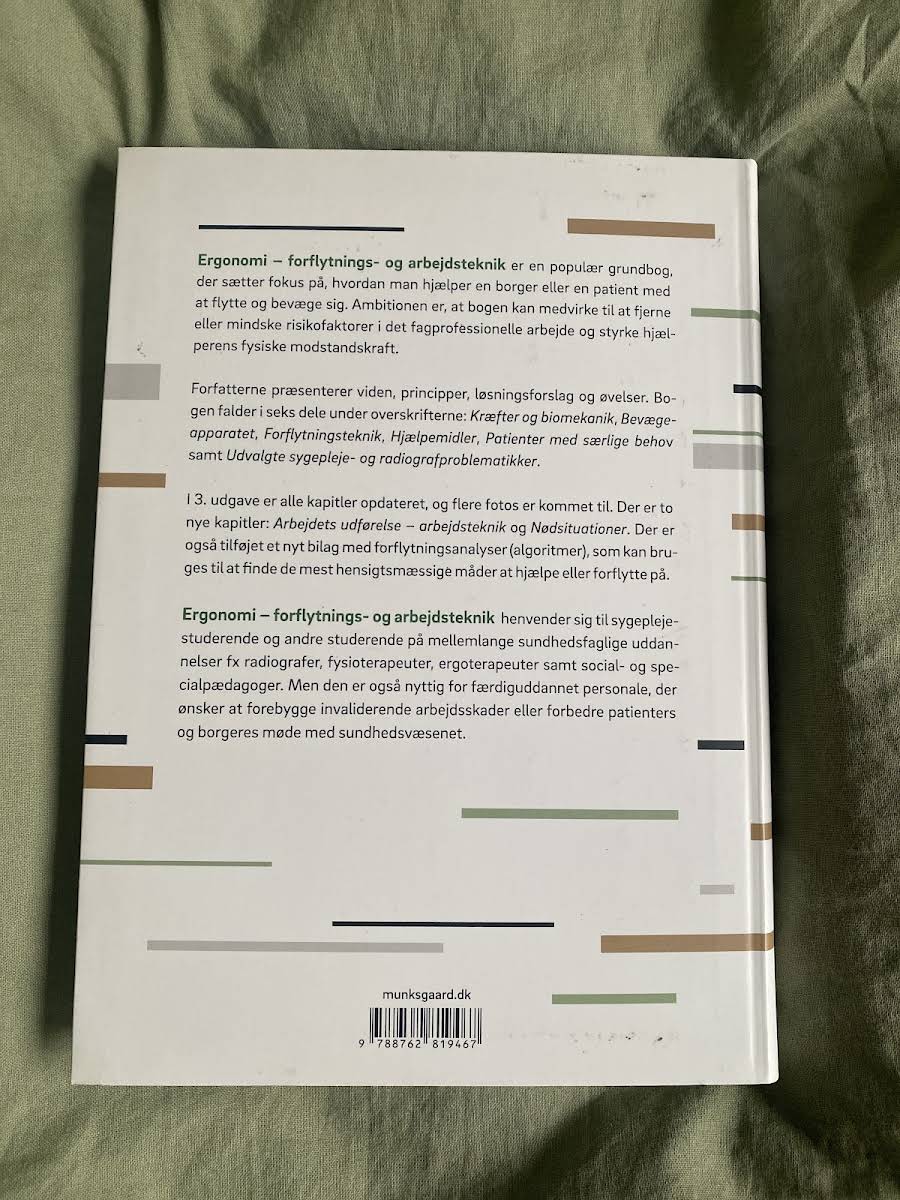 Ergonomi er en grundbog, der sætter fokus på, hvordan fagpersoner sikrer en sikker og effektiv måde at flytte og støtte borgere og patienter på. Bogen sigter mod at reducere de risikofaktorer, der kan opstå i det faglige arbejde, og samtidig styrke hjælperens fysiske robusthed. I denne 3. udgave præsenterer forfatterne Maiken Böcher og Marianne Mogensen opdateret viden, principper, løsningsforslag og en række praktiske øvelser. Værket er struktureret i seks hoveddele, herunder temaer som kræfter og biomekanik, bevægeapparatet, forflytningsteknik, hjælpemidler, og patienter med særlige behov samt udvalgte problematikker inden for sygepleje og radiografi. Opdateringerne i denne udgave omfatter friske fotografier og to nye kapitler om Arbejdets udførelse – arbejdsteknik og Nødsituationer. Derudover er et nyt bilag med forflytningsanalyser blevet tilføjet, som tilbyder et praktisk redskab til at identificere de mest hensigtsmæssige metoder til forflytning. Bogen henvender sig primært til sygeplejestuderende og andre studerende på de mellemlange sundhedsfaglige uddannelser som radiografer, fysioterapeuter, ergoterapeuter samt social- og specialpædagoger, men den er også et værdifuldt redskab for fagpersoner, der ønsker at forebygge arbejdsskader og forbedre interaktionen med patienter og borgere.
