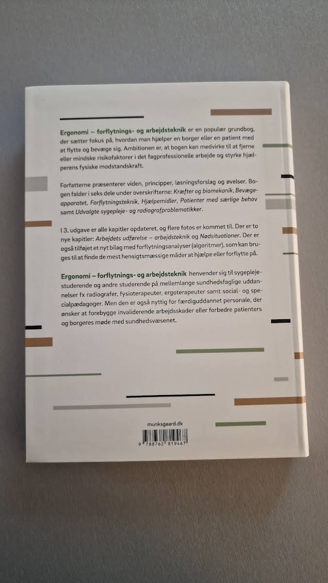 Ergonomi er en grundbog, der sætter fokus på, hvordan fagpersoner sikrer en sikker og effektiv måde at flytte og støtte borgere og patienter på. Bogen sigter mod at reducere de risikofaktorer, der kan opstå i det faglige arbejde, og samtidig styrke hjælperens fysiske robusthed. I denne 3. udgave præsenterer forfatterne Maiken Böcher og Marianne Mogensen opdateret viden, principper, løsningsforslag og en række praktiske øvelser. Værket er struktureret i seks hoveddele, herunder temaer som kræfter og biomekanik, bevægeapparatet, forflytningsteknik, hjælpemidler, og patienter med særlige behov samt udvalgte problematikker inden for sygepleje og radiografi. Opdateringerne i denne udgave omfatter friske fotografier og to nye kapitler om Arbejdets udførelse – arbejdsteknik og Nødsituationer. Derudover er et nyt bilag med forflytningsanalyser blevet tilføjet, som tilbyder et praktisk redskab til at identificere de mest hensigtsmæssige metoder til forflytning. Bogen henvender sig primært til sygeplejestuderende og andre studerende på de mellemlange sundhedsfaglige uddannelser som radiografer, fysioterapeuter, ergoterapeuter samt social- og specialpædagoger, men den er også et værdifuldt redskab for fagpersoner, der ønsker at forebygge arbejdsskader og forbedre interaktionen med patienter og borgere.