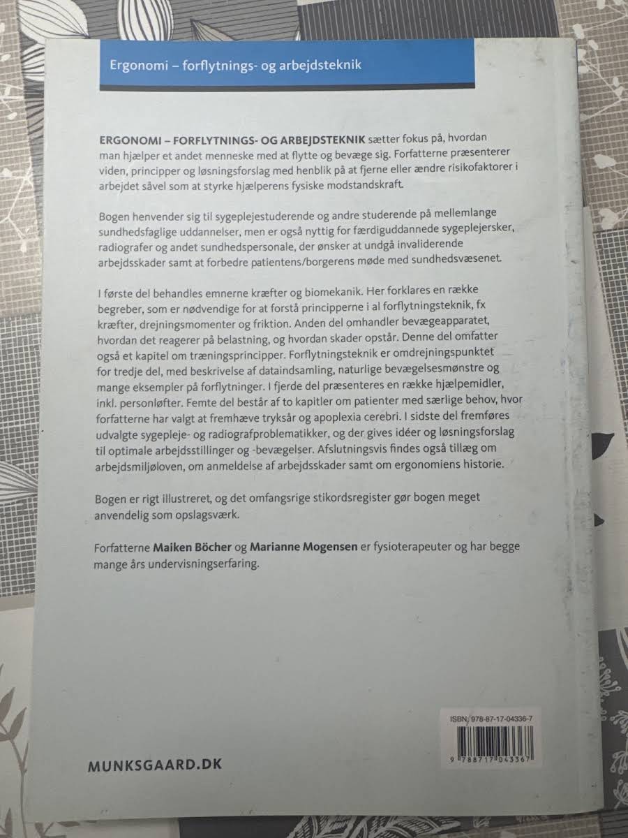 Ergonomi – Forflytnings- og arbejdsteknik giver en grundlæggende forståelse for, hvordan korrekt bevægelse og forflytning kan fremme patientens velbefindende og samtidig forebygge arbejdsskader. Bogen præsenterer en række velafprøvede teknikker og løsningsforslag, som understøtter sundhedspersonalets hverdag og forbedrer den praktiske tilgang til forflytningsopgaver. Med sine mange detaljerede illustrationer og et omfattende indeks fungerer lærebogen som et værdifuldt opslagsværk for studerende inden for sygepleje og andre sundhedsfag. Forfatterne Marianne Mogensen og Maiken Böcher, er erfarne fysioterapeuter og undervisere, hvilket sikrer en solid og pædagogisk formidling af emnet.