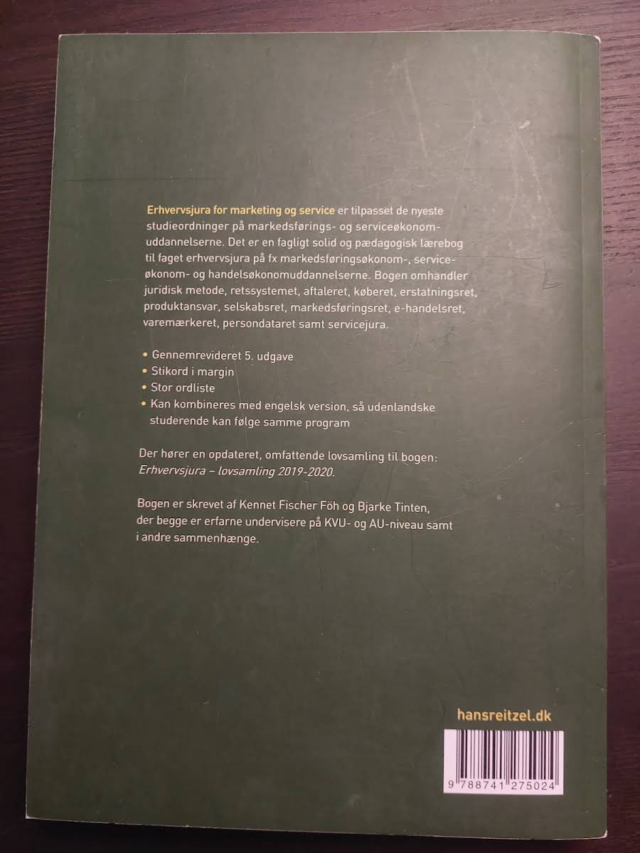 Erhvervsjura – for marketing og service i 5. udgave er blevet opdateret og tilpasset de seneste studieordninger. Bogen styrker de studerendes evne til at inddrage juridiske aspekter i forbindelse med innovation og udveksling med både kunder og leverandører. Med en bred dækning af emner som juridisk metode, retsvæsenet, aftaleret, køb og erstatningsret, udvider bogen forståelsen af produktansvar, selskabsret, markedsføringsret, e-handelsret og varemærkeret. Endvidere findes der særlige kapitler, der behandler persondata og service, hvilket gør den til et uundværligt redskab for kommende marketing- og serviceøkonomer.