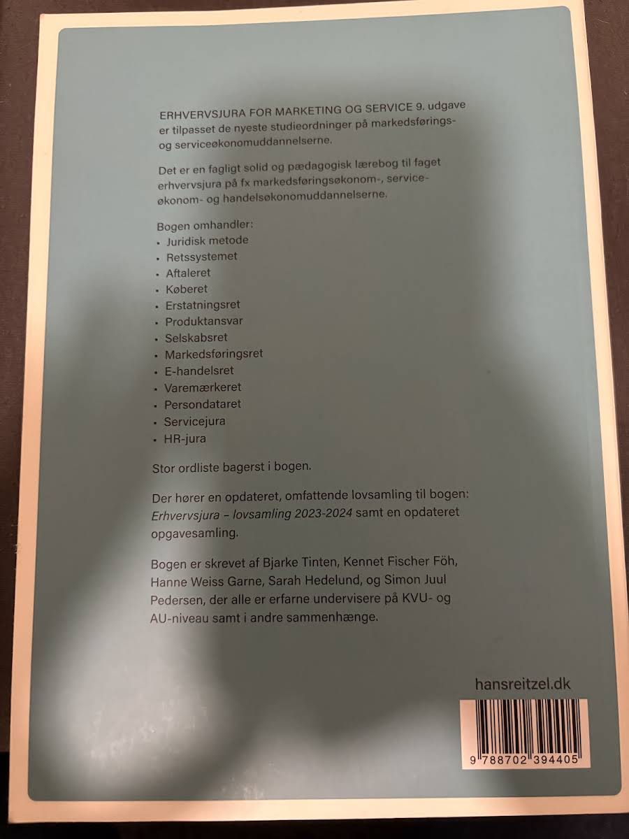 Erhvervsjura – for marketing og service, 9. udgave, er en fagligt solid og pædagogisk lærebog designet til studerende på markedsførings-, service- og handelsøkonomuddannelserne. Bogen er tilpasset de nyeste studieordninger og giver et solidt grundlag for forståelsen af erhvervsjura med særlig relevans inden for marketing og service. Bogen behandler alle de centrale juridiske områder, herunder juridisk metode, retssystemet, aftaleret, køberet, erstatningsret, produktansvar, selskabsret, markedsføringsret, e-handelsret, varemærkeret, persondataret samt servicejura og HR-jura. Sammen med lærebogen følger en opdateret og omfattende lovsamling – Erhvervsjura – lovsamling 2023-2024 – samt en ny opgavesamling, der understøtter læring og faglig fordybelse.
