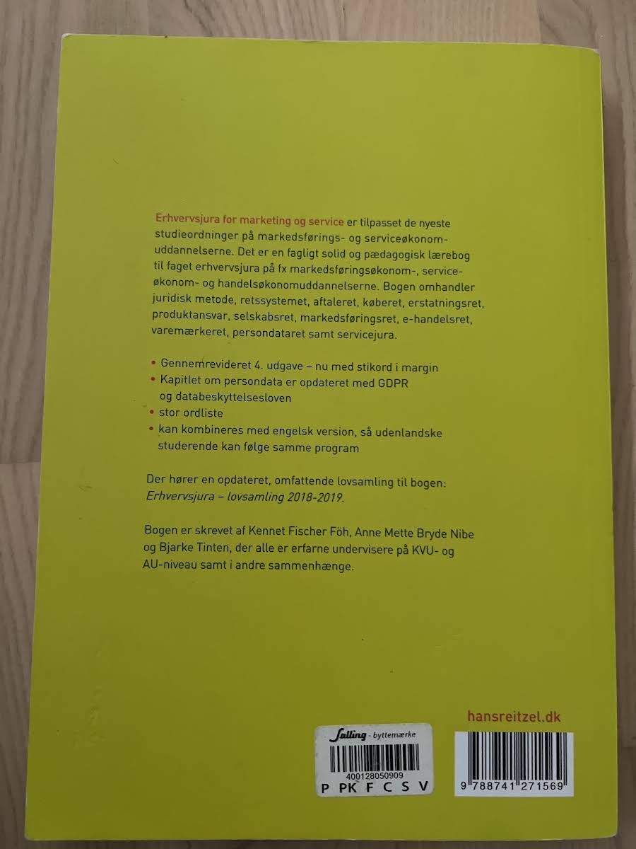 Erhvervsjura - for marketing og service i 4. udgave giver et indgående overblik over de juridiske aspekter, der er relevante for studerende inden for markedsføring og service. Bogen, udgivet af Hans Reitzel i 2018, er tilpasset de nyeste studieordninger og forbereder læseren på at anvende juridiske metoder i relation til innovation og handel. Med et bredt temaområde dykker bogen ned i nøgleemner som retsvæsen, aftaleret, køb, erstatningsret, produktansvar, selskabsret, markedsføringsret, e-handelsret og varemærkeret. Desuden indeholder den selvstændige kapitler om behandlingen af persondata og om service, hvilket giver et solidt fundament for de juridiske problemstillinger, der opstår i en kommerciel kontekst.