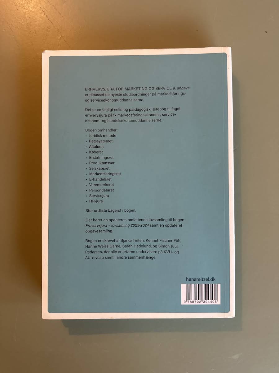 Erhvervsjura – for marketing og service, 9. udgave, er en fagligt solid og pædagogisk lærebog designet til studerende på markedsførings-, service- og handelsøkonomuddannelserne. Bogen er tilpasset de nyeste studieordninger og giver et solidt grundlag for forståelsen af erhvervsjura med særlig relevans inden for marketing og service. Bogen behandler alle de centrale juridiske områder, herunder juridisk metode, retssystemet, aftaleret, køberet, erstatningsret, produktansvar, selskabsret, markedsføringsret, e-handelsret, varemærkeret, persondataret samt servicejura og HR-jura. Sammen med lærebogen følger en opdateret og omfattende lovsamling – Erhvervsjura – lovsamling 2023-2024 – samt en ny opgavesamling, der understøtter læring og faglig fordybelse.