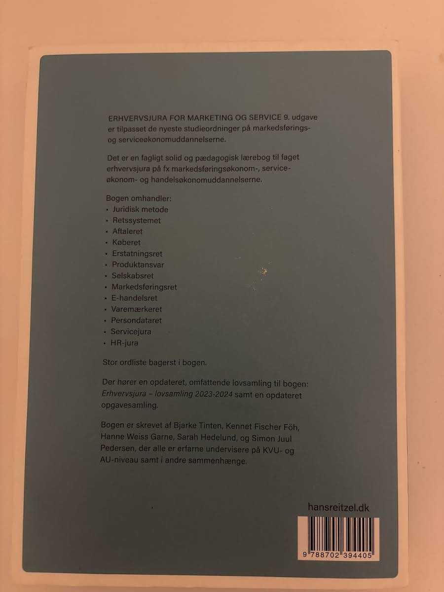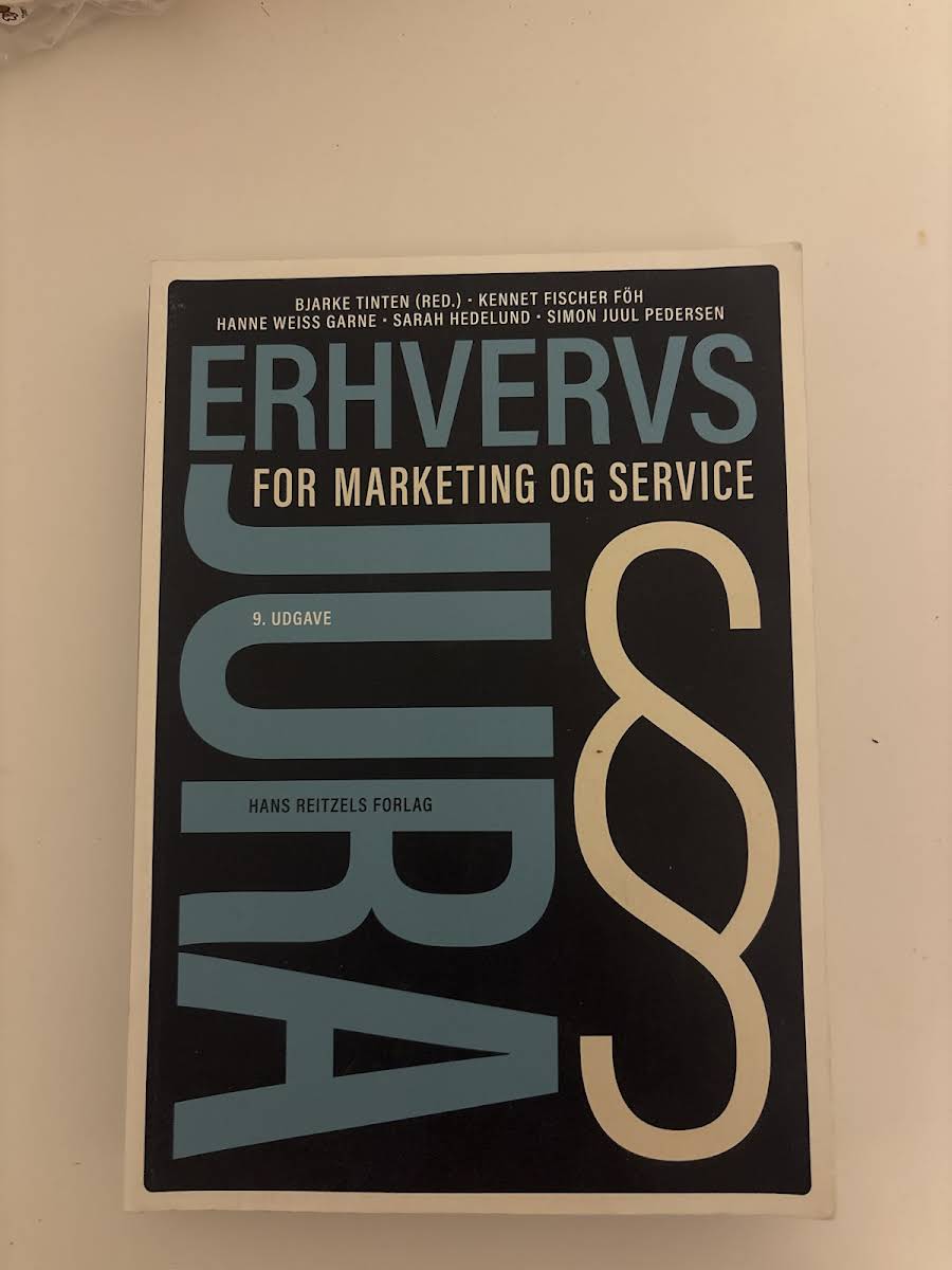Erhvervsjura – for marketing og service, 9. udgave, er en fagligt solid og pædagogisk lærebog designet til studerende på markedsførings-, service- og handelsøkonomuddannelserne. Bogen er tilpasset de nyeste studieordninger og giver et solidt grundlag for forståelsen af erhvervsjura med særlig relevans inden for marketing og service. Bogen behandler alle de centrale juridiske områder, herunder juridisk metode, retssystemet, aftaleret, køberet, erstatningsret, produktansvar, selskabsret, markedsføringsret, e-handelsret, varemærkeret, persondataret samt servicejura og HR-jura. Sammen med lærebogen følger en opdateret og omfattende lovsamling – Erhvervsjura – lovsamling 2023-2024 – samt en ny opgavesamling, der understøtter læring og faglig fordybelse.
