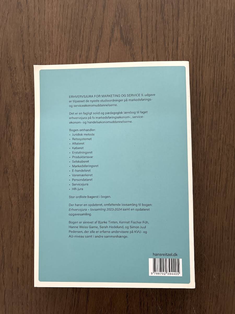 Erhvervsjura – for marketing og service, 9. udgave, er en fagligt solid og pædagogisk lærebog designet til studerende på markedsførings-, service- og handelsøkonomuddannelserne. Bogen er tilpasset de nyeste studieordninger og giver et solidt grundlag for forståelsen af erhvervsjura med særlig relevans inden for marketing og service. Bogen behandler alle de centrale juridiske områder, herunder juridisk metode, retssystemet, aftaleret, køberet, erstatningsret, produktansvar, selskabsret, markedsføringsret, e-handelsret, varemærkeret, persondataret samt servicejura og HR-jura. Sammen med lærebogen følger en opdateret og omfattende lovsamling – Erhvervsjura – lovsamling 2023-2024 – samt en ny opgavesamling, der understøtter læring og faglig fordybelse.