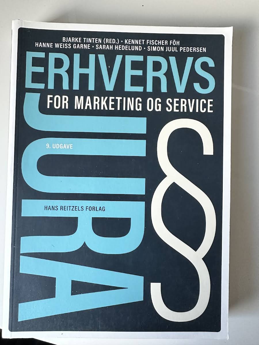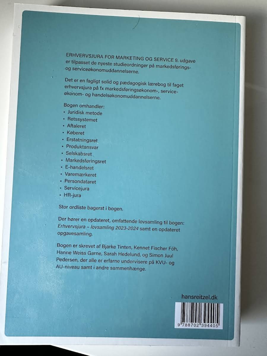 Erhvervsjura – for marketing og service, 9. udgave, er en fagligt solid og pædagogisk lærebog designet til studerende på markedsførings-, service- og handelsøkonomuddannelserne. Bogen er tilpasset de nyeste studieordninger og giver et solidt grundlag for forståelsen af erhvervsjura med særlig relevans inden for marketing og service. Bogen behandler alle de centrale juridiske områder, herunder juridisk metode, retssystemet, aftaleret, køberet, erstatningsret, produktansvar, selskabsret, markedsføringsret, e-handelsret, varemærkeret, persondataret samt servicejura og HR-jura. Sammen med lærebogen følger en opdateret og omfattende lovsamling – Erhvervsjura – lovsamling 2023-2024 – samt en ny opgavesamling, der understøtter læring og faglig fordybelse.