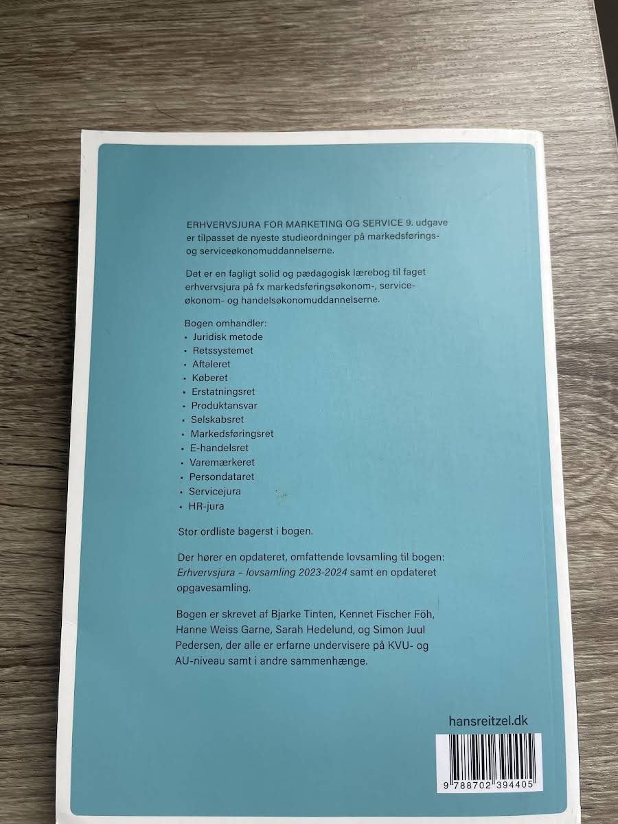 Erhvervsjura – for marketing og service, 9. udgave, er en fagligt solid og pædagogisk lærebog designet til studerende på markedsførings-, service- og handelsøkonomuddannelserne. Bogen er tilpasset de nyeste studieordninger og giver et solidt grundlag for forståelsen af erhvervsjura med særlig relevans inden for marketing og service. Bogen behandler alle de centrale juridiske områder, herunder juridisk metode, retssystemet, aftaleret, køberet, erstatningsret, produktansvar, selskabsret, markedsføringsret, e-handelsret, varemærkeret, persondataret samt servicejura og HR-jura. Sammen med lærebogen følger en opdateret og omfattende lovsamling – Erhvervsjura – lovsamling 2023-2024 – samt en ny opgavesamling, der understøtter læring og faglig fordybelse.
